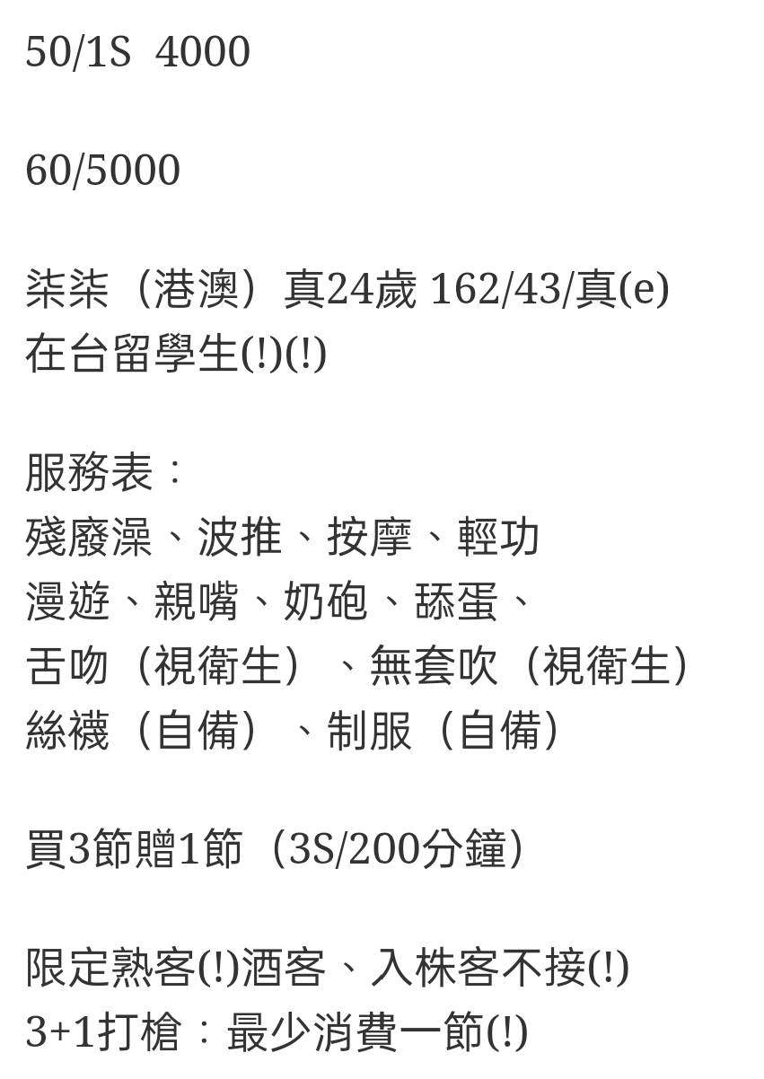 🇨🇳台中北區港澳妹 柒柒 http://verytai.net/wp-content/uploads/2024/11/LINE_MOVIE_1732069780454.mp4 50/1S 4000 60/5000 柒柒(港澳)真24歲 162/43/真(e) 在台留學生(!)(!) 服務表: 殘廢澡、波推、按摩、輕功 漫遊、親嘴、奶砲、舔蛋、 舌吻(視衛生)、無套吹(視衛生) 絲襪(自備)、制服(自備) 買3節贈1節(3S/200分鐘) 限定熟客(!)酒客、入株客不接(!) 3+1打槍:最少消費一節(!) 相關商品 Quick View Quick View 🇲🇾台中北區馬來妹 如如 Quick View Quick View 🇲🇾台中西屯馬來妹 婉蓉 Quick View Quick View 🇲🇾台中北區馬來妹 妮暄