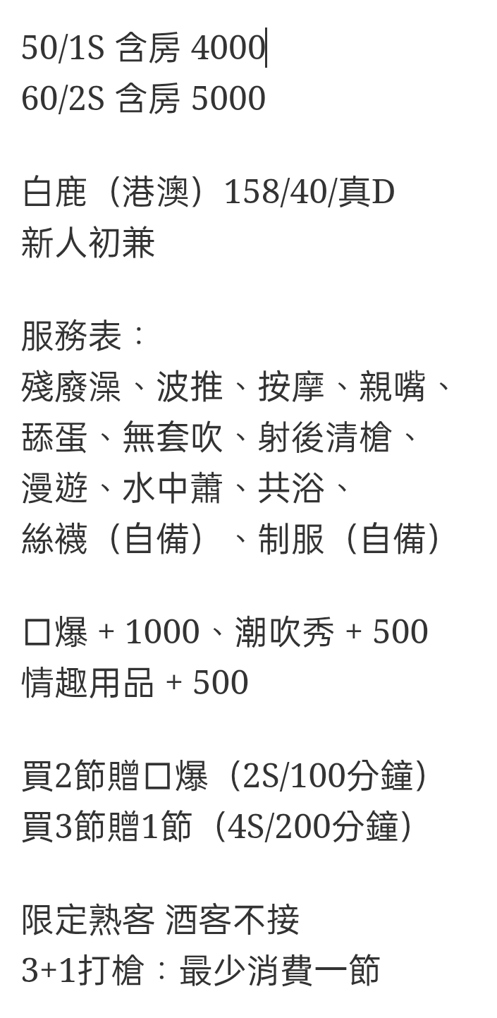🇨🇳台中西屯港澳妹 白鹿 http://verytai.net/wp-content/uploads/2025/10/LINE_MOVIE_1760308360747.mp4 50/1S 含房 4000 60/2S 含房 5000 白鹿(港澳)158/40/真D 新人初兼 服務表: 殘廢澡、波推、按摩、親嘴、 舔蛋、無套吹、射後清槍、 漫遊、水中蕭、共浴、 絲襪(自備)、制服(自備) 口爆 + 1000、潮吹秀 + 500 情趣用品 + 500 買2節贈口爆(2S/100分鐘) 買3節贈1節(4S/200分鐘) 限定熟客 酒客不接 3+1打槍:最少消費一節 相關商品 Quick View Quick View 🇨🇳台中北屯港澳妹 羽娜 Quick View Quick View 🇨🇳台中西屯港澳妹 芊芊 Quick View Quick View 🇰🇷台中北區泡菜妹 智優