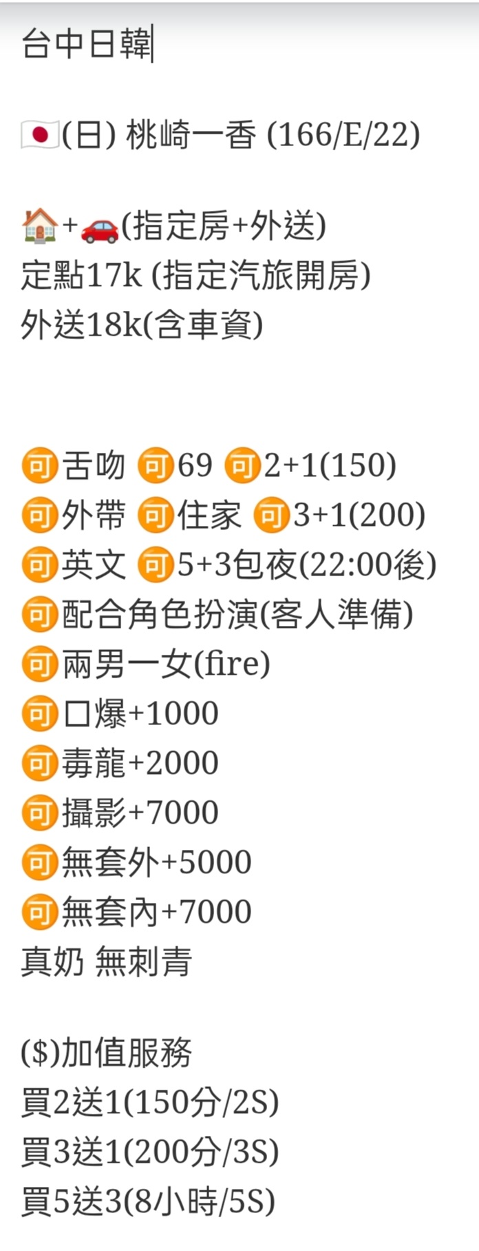 🇯🇵台中西屯櫻花妹 桃崎一香 台中日韓 (日) 桃崎一香 (166/E/22) (指定房+外送) 定點17k (指定汽旅開房) 外送18k(含車資) 舌吻 69 2+1(150) 外帶 住家 3+1(200) 英文 5+3包夜(22:00後) 配合角色扮演(客人準備) 兩男一女(fire) 口爆+1000 毒龍+2000 攝影+7000 無套外+5000 無套內+7000 真奶 無刺青 ($)加值服務 買2送1(150分/2S) 買3送1(200分/3S) 買5送3(8小時/5S) 相關商品 Quick View Quick View 🇯🇵台中西屯櫻花妹 亞里莎 Quick View Quick View 🇨🇳台中西屯港澳妹 妃雅 Quick View Quick View 🇻🇳台中西屯越妹 智雅