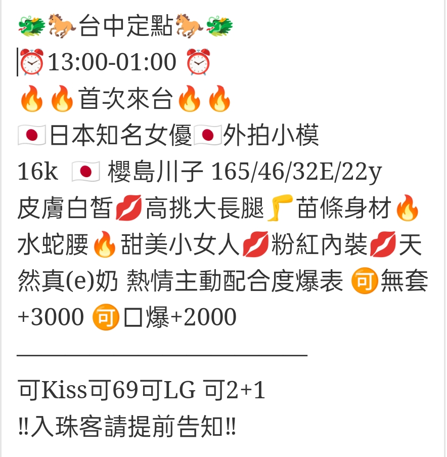 🇯🇵台中西屯櫻花妹 櫻島川子 台中定點 ⏰13:00-01:00 ⏰ 首次來台 日本知名女優 外拍小模 16k 櫻島川子 165/46/32E/22y 皮膚白皙 高挑大長腿 苗條身材 水蛇腰 甜美小女人 粉紅內裝 天然真(e)奶 熱情主動配合度爆表 無套+3000 口爆+2000 ———————————— 可Kiss可69可LG 可2+1 ‼️入珠客請提前告知‼️ 相關商品 Quick View Quick View 🇰🇷台中西屯泡菜妹 莫妮卡 Quick View Quick View 🇻🇳台中西屯越妹 夢子 Quick View Quick View 🇯🇵台中西屯櫻花妹 森下美緒