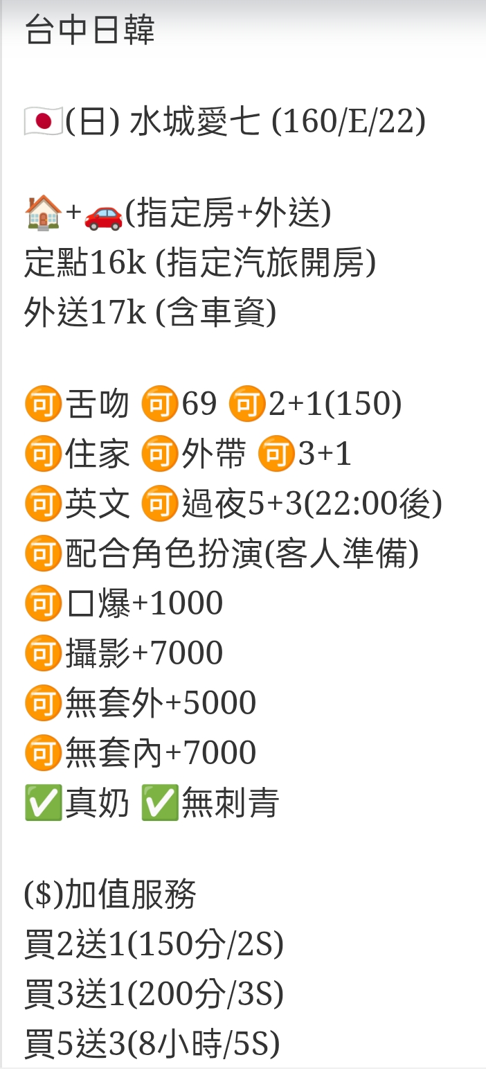 🇯🇵台中西屯櫻花妹 水城愛七 台中日韓 🇯🇵(日) 水城愛七 (160/E/22) (指定房+外送) 定點16k (指定汽旅開房) 外送17k (含車資) 舌吻 69 2+1(150) 住家 外帶 3+1 英文 過夜5+3(22:00後) 配合角色扮演(客人準備) 口爆+1000 攝影+7000 無套外+5000 無套內+7000 ✅️真奶 ✅️無刺青 ($)加值服務 買2送1(150分/2S) 買3送1(200分/3S) 買5送3(8小時/5S) 相關商品 Quick View Quick View 🇯🇵台中西屯櫻花妹 麗子 Quick View Quick View 🇻🇳台中西屯越妹 YuYu Quick View Quick View ??台中西屯日本AV 杉浦花音