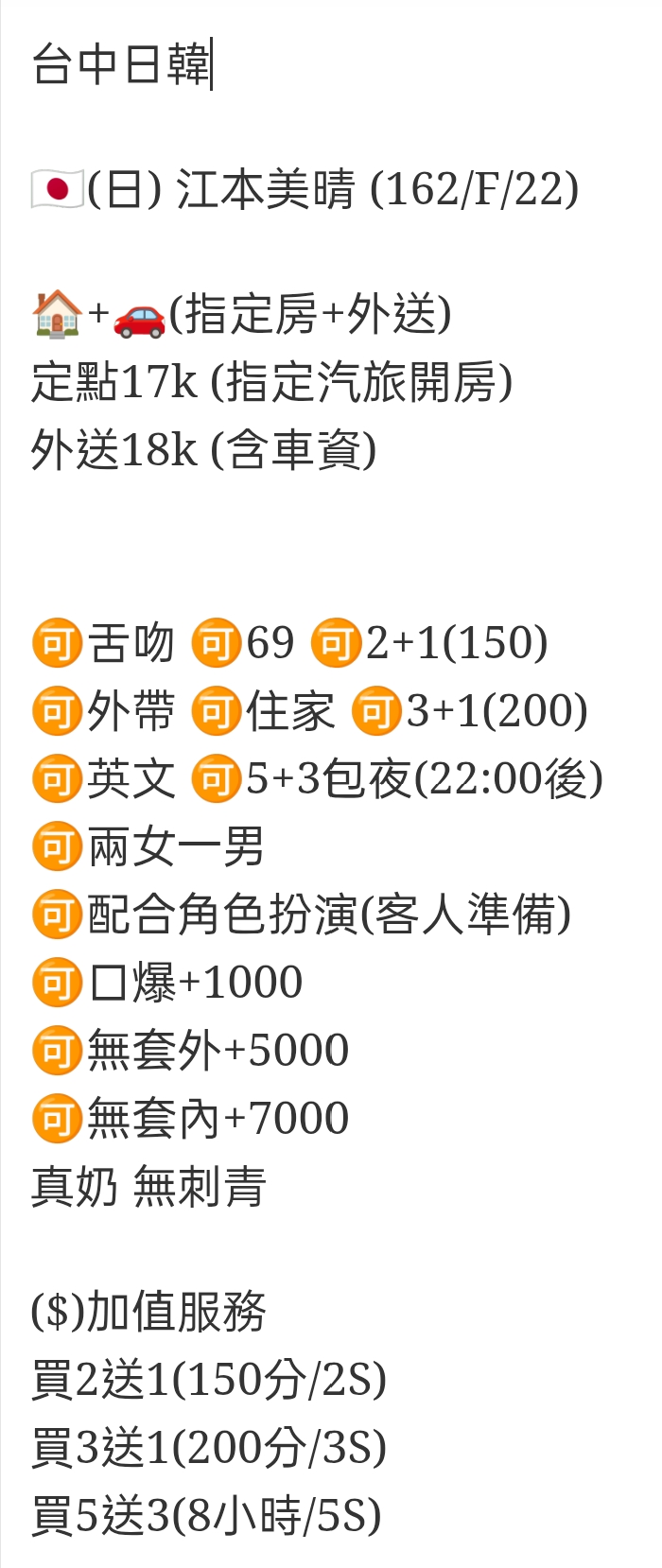 🇯🇵台中西屯櫻花妹 江本美晴 http://verytai.net/wp-content/uploads/2025/06/LINE_MOVIE_1749872429090.mp4 台中日韓 (日) 江本美晴 (162/F/22) (指定房+外送) 定點17k (指定汽旅開房) 外送18k (含車資) 舌吻 69 2+1(150) 外帶 住家 3+1(200) 英文 5+3包夜(22:00後) 兩女一男 配合角色扮演(客人準備) 口爆+1000 無套外+5000 無套內+7000 真奶 無刺青 ($)加值服務 買2送1(150分/2S) 買3送1(200分/3S) 買5送3(8小時/5S) 相關商品 Quick View Quick View 🇯🇵台中西屯av女優 吹石玲奈 Quick View Quick View 🇷🇺台中西屯金絲貓/可外約 安娜Anna Quick View Quick View 🇲🇾台中西屯馬來妹 歐比