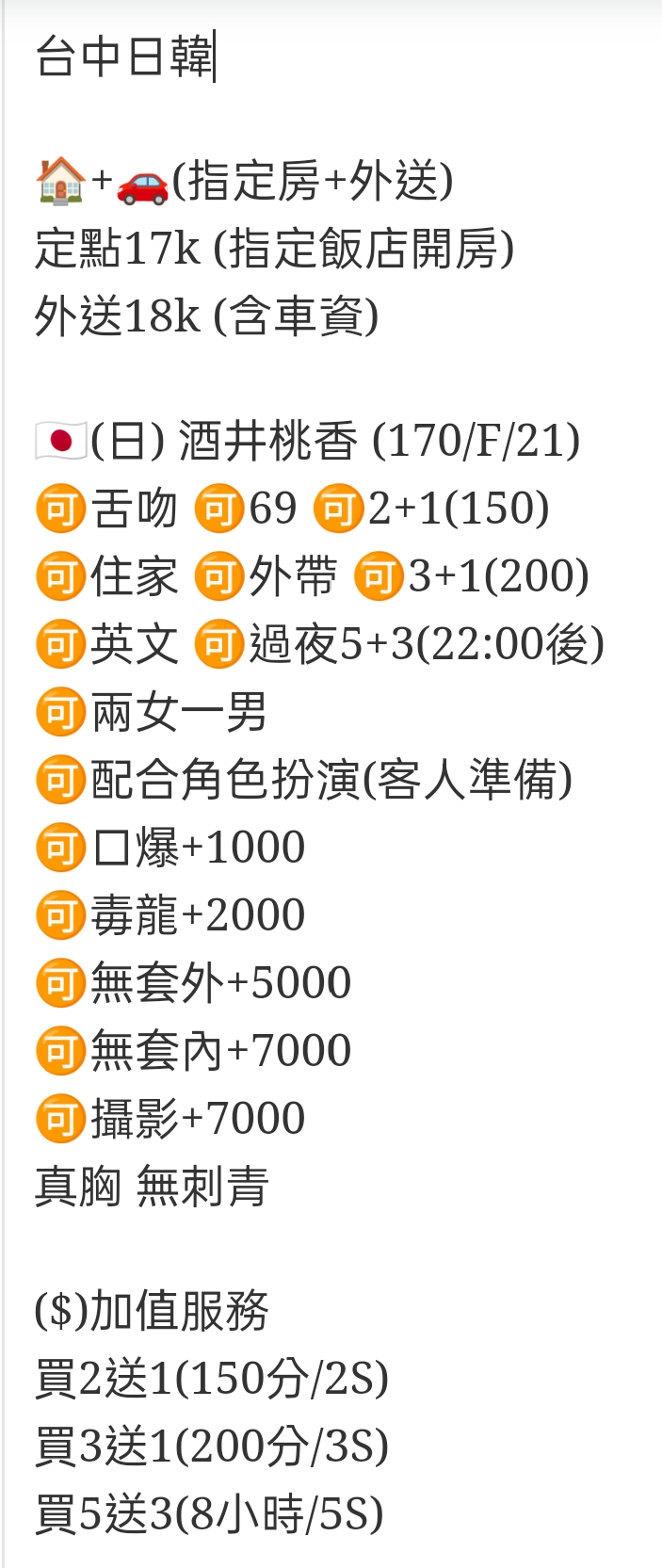🇯🇵台中西屯櫻花妹 酒井桃香 http://verytai.net/wp-content/uploads/2025/01/LINE_MOVIE_1737248535299.mp4 台中日韓 (指定房+外送) 定點17k (指定飯店開房) 外送18k (含車資) (日) 酒井桃香 (170/F/21) 舌吻 69 2+1(150) 住家 外帶 3+1(200) 英文 過夜5+3(22:00後) 兩女一男 配合角色扮演(客人準備) 口爆+1000 毒龍+2000 無套外+5000 無套內+7000 攝影+7000 真胸 無刺青 ($)加值服務 買2送1(150分/2S) 買3送1(200分/3S) 買5送3(8小時/5S) 相關商品 Quick View Quick View 🇯🇵台中西屯櫻花妹 森下美緒 Quick View Quick View 🇨🇳台中西屯港澳妹 青青 Quick View Quick View 🇻🇳台中西屯越妹 雪碧