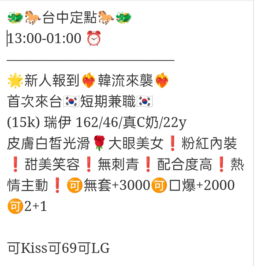 🇰🇷台中西屯泡菜妹 瑞伊 🐲🐎台中定點🐎🐲 13:00-01:00 ⏰ ———————————— 🌟新人報到❤️🔥韓流來襲❤️🔥 首次來台🇰🇷短期兼職🇰🇷 (15k) 瑞伊 162/46/真C奶/22y 皮膚白皙光滑🌹大眼美女❗️粉紅內裝❗️甜美笑容❗️無刺青❗️配合度高❗️熱情主動❗️🉑無套+3000🉑口爆+2000🉑2+1 可Kiss可69可LG 相關商品 Quick View Quick View ??台中西屯日本AV 杉浦花音 Quick View Quick View 🇻🇳台中西屯越妹 萌萌 Quick View Quick View 🇷🇺台中西屯金絲貓/可外約 安娜Anna