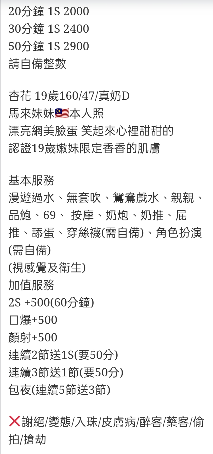 漫遊過水、無套吹、鴛鴦戲水、親親、品鮑、69、 按摩、奶炮、奶推、屁推、舔蛋、穿絲襪(需自備)、角色扮演(需自備)
