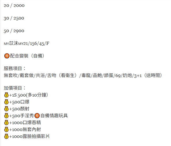 🇲🇾員林定點馬來妹 苡沫 20 / 2000 30 / 2500 50 / 2900 苡沫 21/156/45/F 配合變裝(自備) 服務項目: 無套吹/戴套做/共浴/舌吻(看衛生)/毒龍/品鮑/舔蛋/69/奶炮/3+1(送時間) 加價項目: +1S 500(多10分鐘) +500口爆 +500顏射 +500手淫秀?自備情趣玩具 +1000口爆吞精 +1000無套內射 +1000露臉拍攝影片 相關商品 Quick View Quick View 🇻🇳員林定點越妹 希媛 Quick View Quick View 🇲🇾員林定點馬來妹 香婷 Quick View Quick View 🇲🇾員林定點馬來妹 梨香