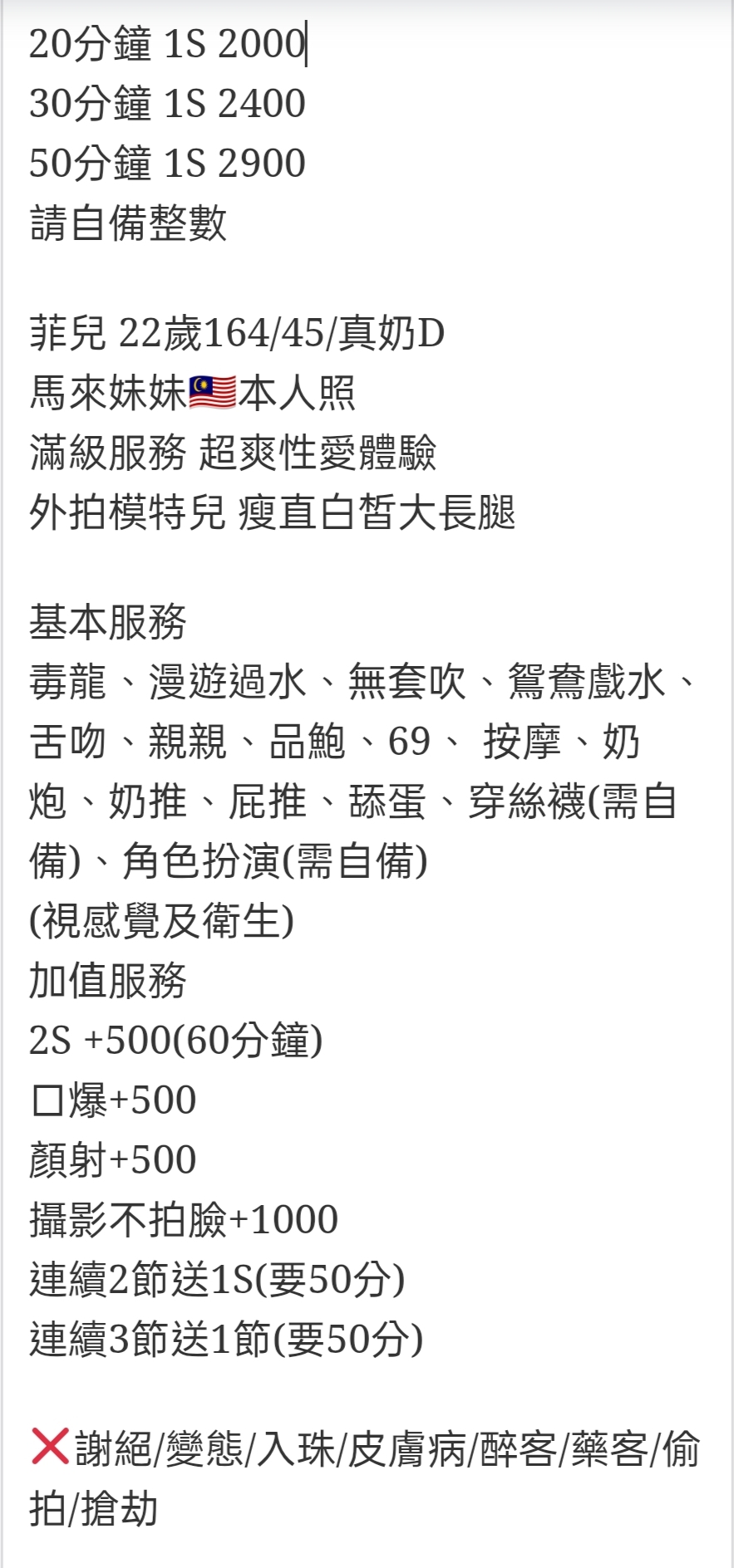 毒龍、漫遊過水、無套吹、鴛鴦戲水、舌吻、親親、品鮑、69、 按摩、奶炮、奶推、屁推、舔蛋、穿絲襪(需自備)、角色扮演(需自備)