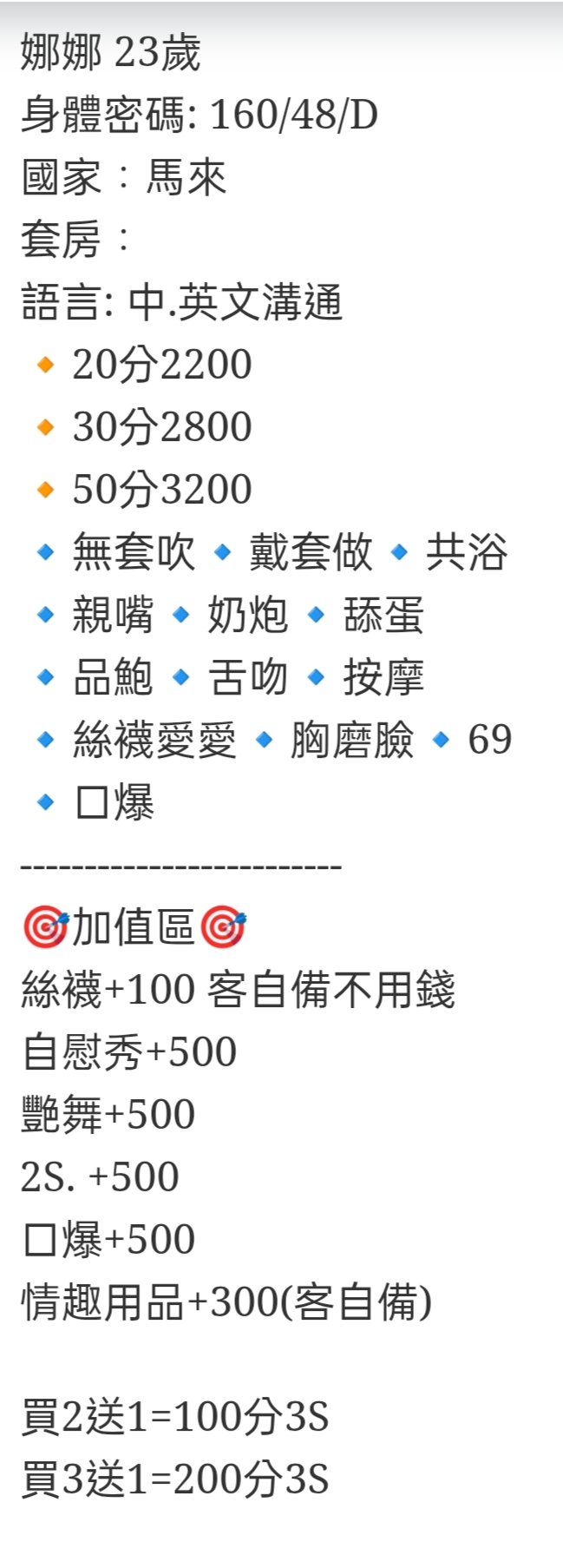 🇲🇾台中后里馬來妹 娜娜 娜娜 23歲 身體密碼: 160/48/D 國家:馬來 套房: 語言: 中.英文溝通 20分2200 30分2800 50分3200 無套吹 戴套做 共浴 親嘴 奶炮 舔蛋 品鮑 舌吻 按摩 絲襪愛愛 胸磨臉 69 口爆 ————————- 加值區 絲襪+100 客自備不用錢 自慰秀+500 艷舞+500 2S. +500 口爆+500 情趣用品+300(客自備) 買2送1=100分3S 買3送1=200分3S 相關商品 Quick View Quick View 🇲🇾台中后里馬來妹 柔柔 Quick View Quick View 🇲🇾台中潭子馬來妹 奶妹 Quick View Quick View 🇲🇾台中東區馬來妹 安妮