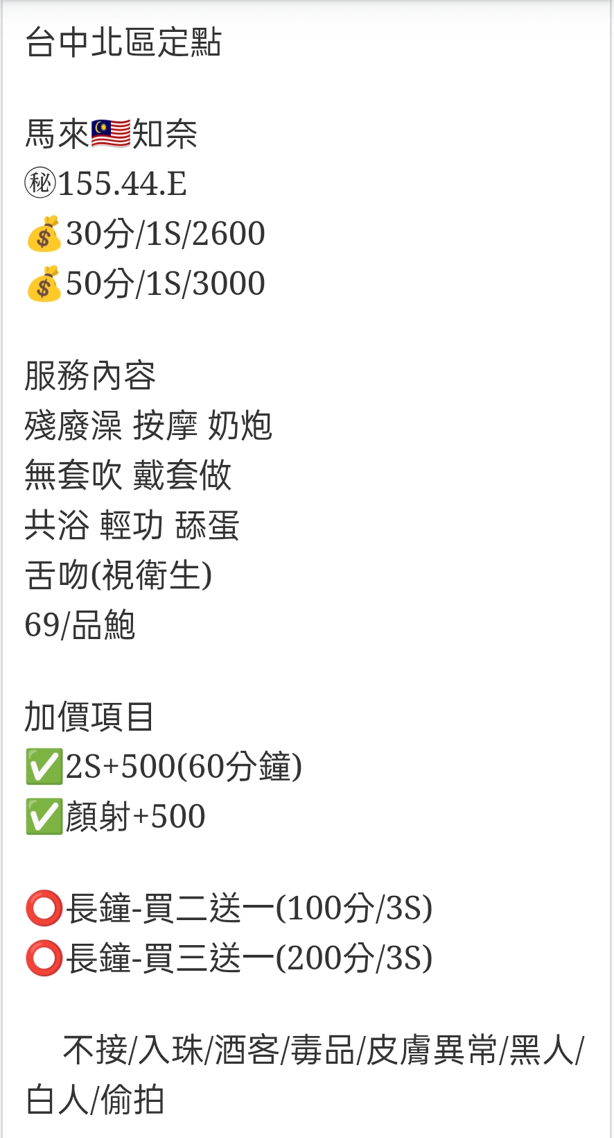 🇲🇾台中北區馬來妹 知奈 台中北區定點 馬來🇲🇾知奈 ㊙️155.44.E 💰30分/1S/2600 💰50分/1S/3000 服務內容 殘廢澡 按摩 奶炮 無套吹 戴套做 共浴 輕功 舔蛋 舌吻(視衛生) 69/品鮑 加價項目 ✅2S+500(60分鐘) ✅顏射+500 ⭕長鐘-買二送一(100分/3S) ⭕️長鐘-買三送一(200分/3S) ⚠️不接/入珠/酒客/毒品/皮膚異常/黑人/白人/偷拍 相關商品 Quick View Quick View 🇹🇼台中北區定點台妹/可外約 叮噹 Quick View Quick View 🇲🇾台中北區馬來妹 牛乳 Quick View Quick View 🇲🇾台中西屯馬來妹 婉蓉