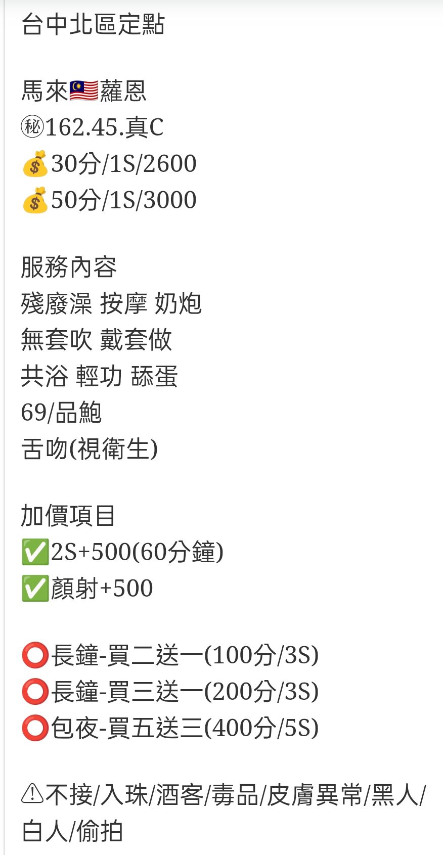 🇲🇾台中北區馬來妹 蘿恩 台中北區定點 馬來🇲🇾蘿恩 ㊙️162.45.真C 💰30分/1S/2600 💰50分/1S/3000 服務內容 殘廢澡 按摩 奶炮 無套吹 戴套做 共浴 輕功 舔蛋 69/品鮑 舌吻(視衛生) 加價項目 ✅2S+500(60分鐘) ✅顏射+500 ⭕長鐘-買二送一(100分/3S) ⭕長鐘-買三送一(200分/3S) ⭕包夜-買五送三(400分/5S) ⚠️不接/入珠/酒客/毒品/皮膚異常/黑人/白人/偷拍 相關商品 Quick View Quick View 🇹🇼台中北區定點台妹/可外約 娃娃 Quick View Quick View 🇹🇼台中北區定點台妹/可外約 叮噹 Quick View Quick View 🇲🇾台中北區馬來妹 如如