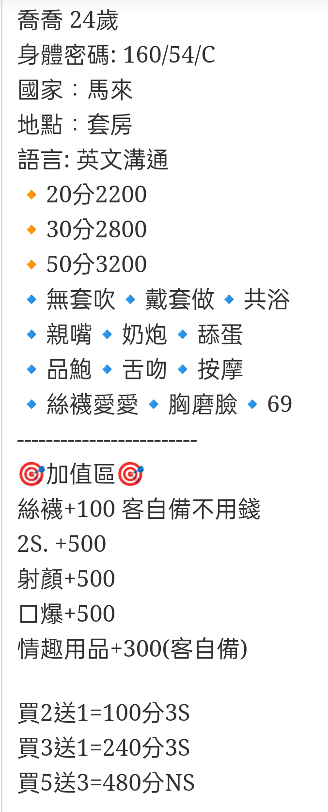🇲🇾台中后里馬來妹 喬喬 喬喬 24歲 身體密碼: 160/54/C 國家:馬來 地點:套房 語言: 英文溝通 🔸20分2200 🔸30分2800 🔸50分3200 🔹無套吹🔹戴套做🔹共浴 🔹親嘴🔹奶炮🔹舔蛋 🔹品鮑🔹舌吻🔹按摩 🔹絲襪愛愛🔹胸磨臉🔹69 ————————- 🎯加值區🎯 絲襪+100 客自備不用錢 2S. +500 射顏+500 口爆+500 情趣用品+300(客自備) 買2送1=100分3S 買3送1=240分3S 買5送3=480分NS 相關商品 Quick View Quick View 🇲🇾台中東區馬來妹 小小 Quick View Quick View 🇲🇾台中后里馬來妹 可可 Quick View Quick View 🇲🇾台中豐原馬來妹 瞳瞳