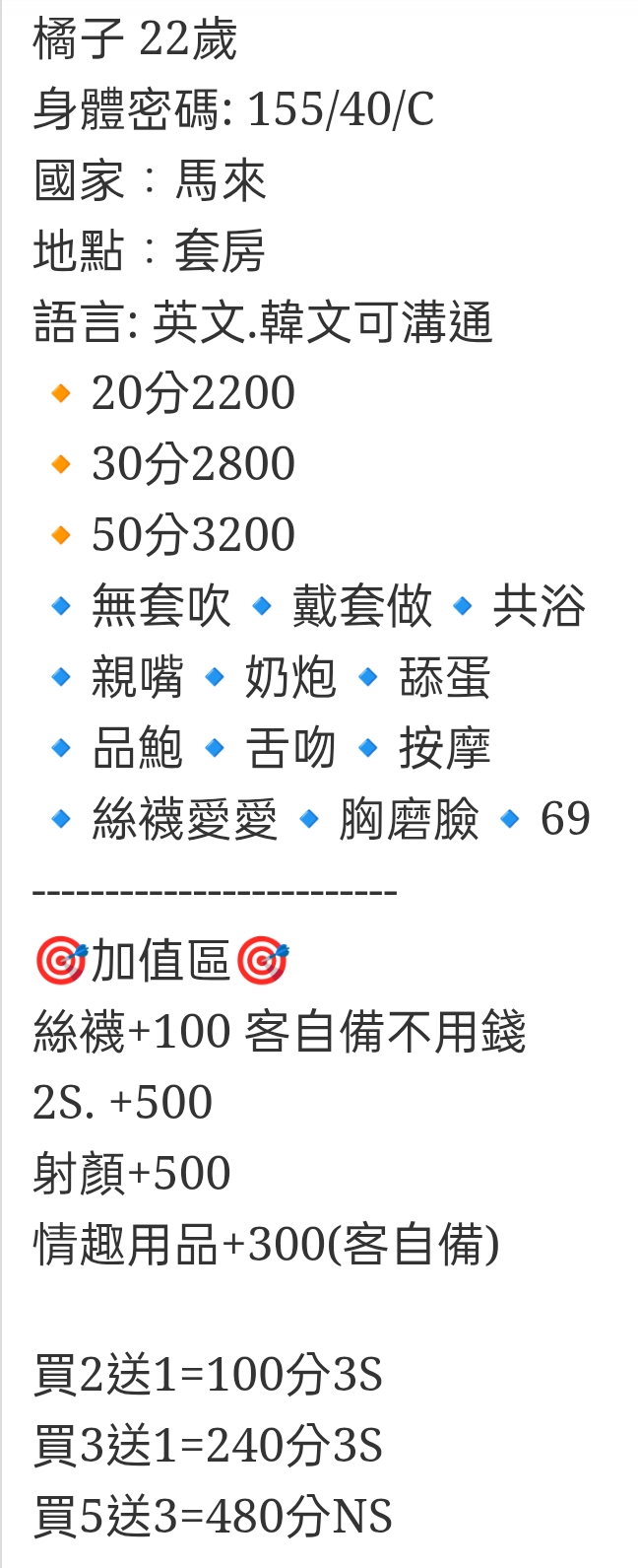 🇲🇾台中潭子馬來妹 橘子 橘子 22歲 身體密碼: 155/40/C 國家:馬來 地點:套房 語言: 英文.韓文可溝通 🔸20分2200 🔸30分2800 🔸50分3200 🔹無套吹🔹戴套做🔹共浴 🔹親嘴🔹奶炮🔹舔蛋 🔹品鮑🔹舌吻🔹按摩 🔹絲襪愛愛🔹胸磨臉🔹69 ————————- 🎯加值區🎯 絲襪+100 客自備不用錢 2S. +500 射顏+500 情趣用品+300(客自備) 買2送1=100分3S 買3送1=240分3S 買5送3=480分NS 相關商品 Quick View Quick View 🇲🇾台中北區馬來妹 Amy Quick View Quick View 🇹🇼台中北區定點台妹/可外約 叮噹 Quick View Quick View 🇲🇾台中北區馬來妹 奶酪