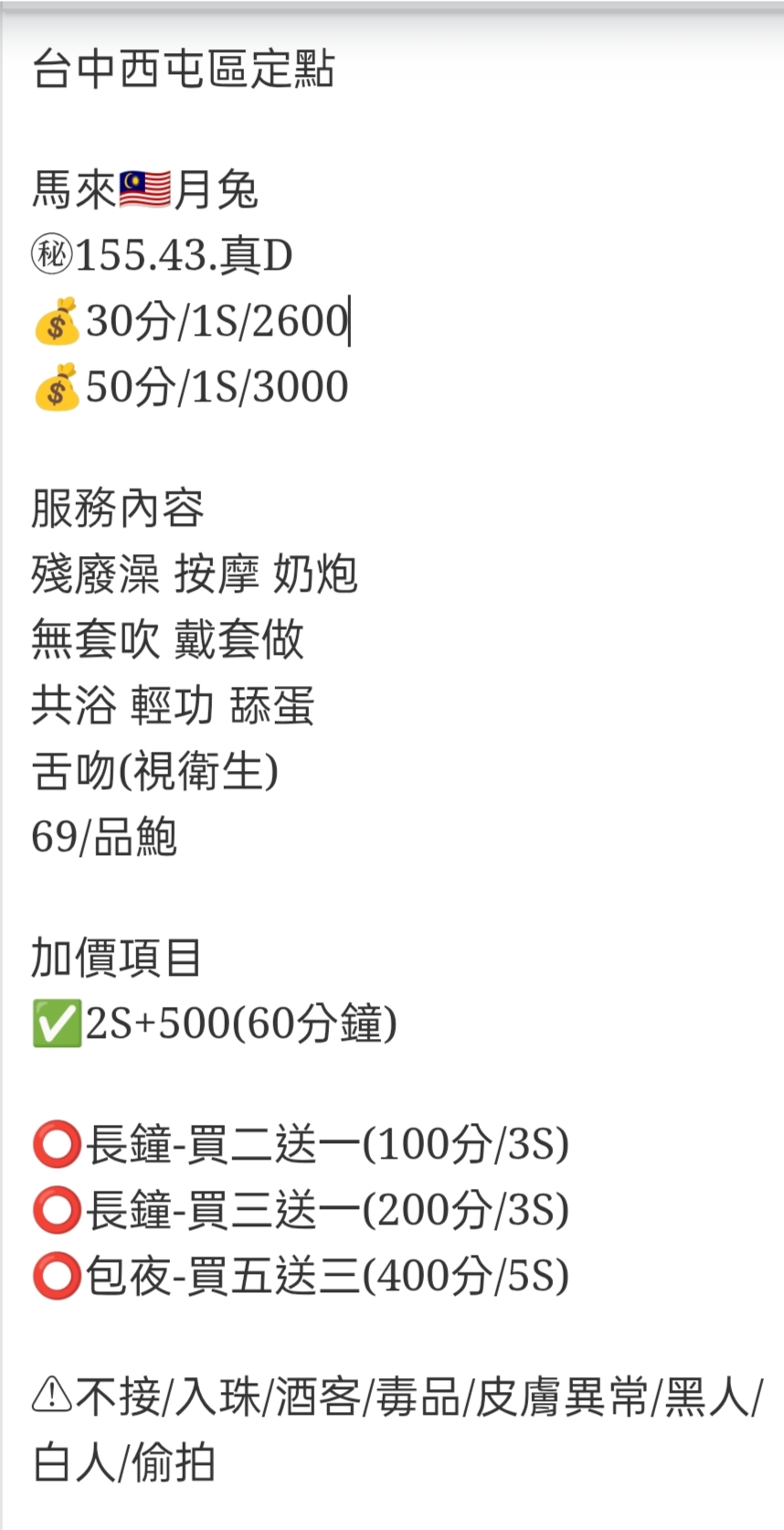 🇲🇾台中西屯馬來妹 月兔 台中西屯區定點 馬來 月兔 ㊙️155.43.真D 30分/1S/2600 50分/1S/3000 服務內容 殘廢澡 按摩 奶炮 無套吹 戴套做 共浴 輕功 舔蛋 舌吻(視衛生) 69/品鮑 加價項目 ✅2S+500(60分鐘) ⭕長鐘-買二送一(100分/3S) ⭕長鐘-買三送一(200分/3S) ⭕包夜-買五送三(400分/5S) ⚠️不接/入珠/酒客/毒品/皮膚異常/黑人/白人/偷拍 相關商品 Quick View Quick View 🇻🇳台中西屯越妹 萌萌 Quick View Quick View 🇨🇳台中北屯港澳妹 羽黛 Quick View Quick View 🇷🇺台中西屯金絲貓/可外約 安娜Anna