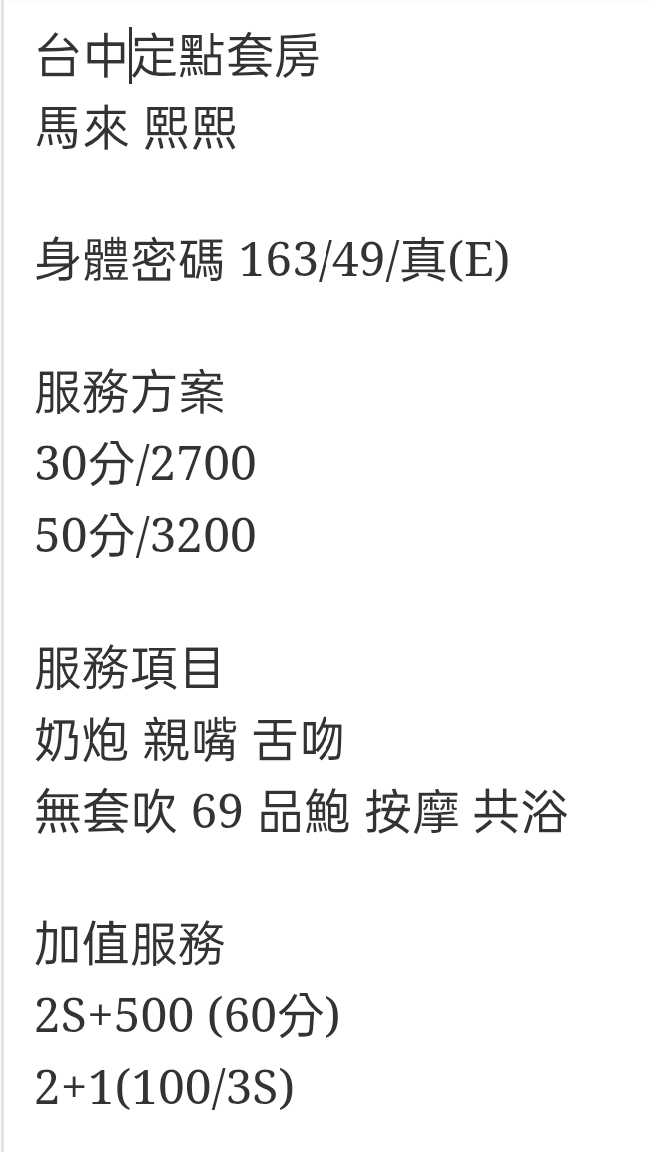 🇲🇾台中西屯馬來妹 熙熙 台中定點套房 馬來 熙熙 身體密碼 163/49/真(E) 服務方案 30分/2700 50分/3200 服務項目 奶炮 親嘴 舌吻 無套吹 69 品鮑 按摩 共浴 加值服務 2S+500 (60分) 2+1(100/3S) 相關商品 Quick View Quick View 🇹🇭台中西屯泰妹 馬奶芳 Quick View Quick View 🇨🇳台中西屯港澳妹 青青 Quick View Quick View 🇷🇺台中西屯金絲貓/可外約 安娜Anna