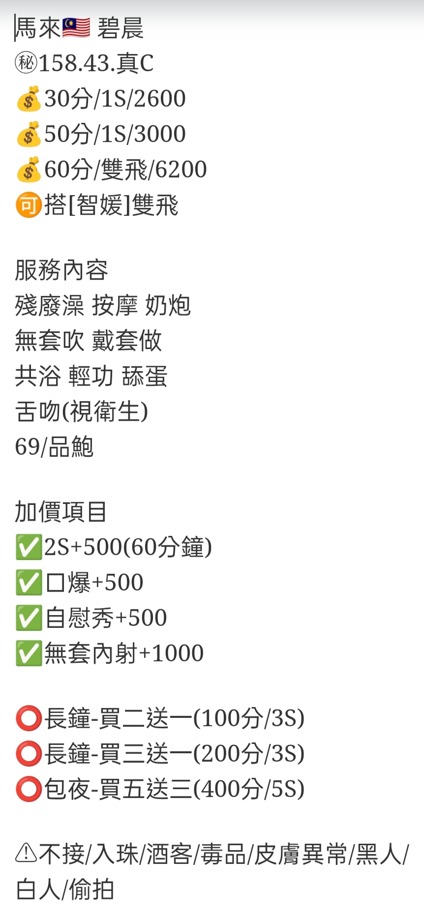 🇲🇾台中北區馬來妹 碧晨 馬來 碧晨 ㊙️158.43.真C 30分/1S/2600 50分/1S/3000 60分/雙飛/6200 搭[智媛]雙飛 服務內容 殘廢澡 按摩 奶炮 無套吹 戴套做 共浴 輕功 舔蛋 舌吻(視衛生) 69/品鮑 加價項目 ✅2S+500(60分鐘) ✅口爆+500 ✅自慰秀+500 ✅無套內射+1000 ⭕長鐘-買二送一(100分/3S) ⭕長鐘-買三送一(200分/3S) ⭕包夜-買五送三(400分/5S) ⚠️不接/入珠/酒客/毒品/皮膚異常/黑人/白人/偷拍 相關商品 Quick View Quick View 🇰🇷台中北區泡菜妹 智優 Quick View Quick View 🇲🇾台中北區馬來妹 甜桃 Quick View Quick View 🇲🇾台中北區馬來妹 乳姬