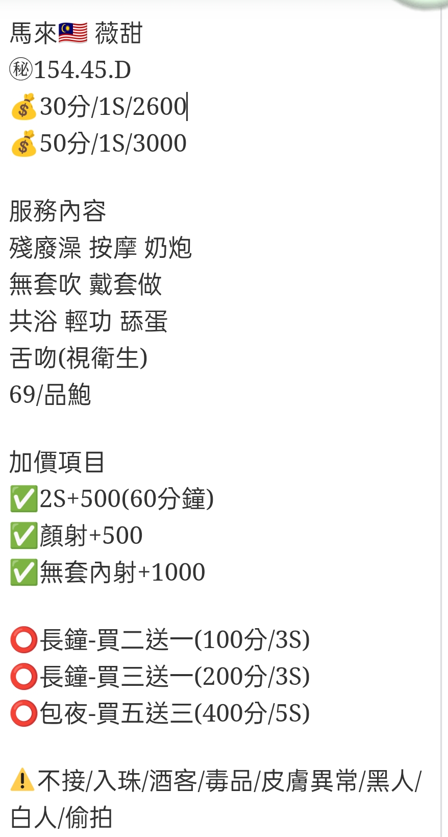 🇲🇾台中西屯馬來妹 薇甜 台中西屯區定點 馬來🇲🇾 薇甜 ㊙️154.45.D 💰30分/1S/2600 💰50分/1S/3000 服務內容 殘廢澡 按摩 奶炮 無套吹 戴套做 共浴 輕功 舔蛋 舌吻(視衛生) 69/品鮑 加價項目 ✅2S+500(60分鐘) ✅顏射+500 ✅無套內射+1000 ⭕長鐘-買二送一(100分/3S) ⭕長鐘-買三送一(200分/3S) ⭕包夜-買五送三(400分/5S) ⚠️不接/入珠/酒客/毒品/皮膚異常/黑人/白人/偷拍 相關商品 Quick View Quick View 🇨🇳台中西屯港澳妹 青青 Quick View Quick View 🇯🇵台中西屯櫻花妹 森下美緒 Quick View Quick View 🇲🇾台中西屯馬來妹 歐比