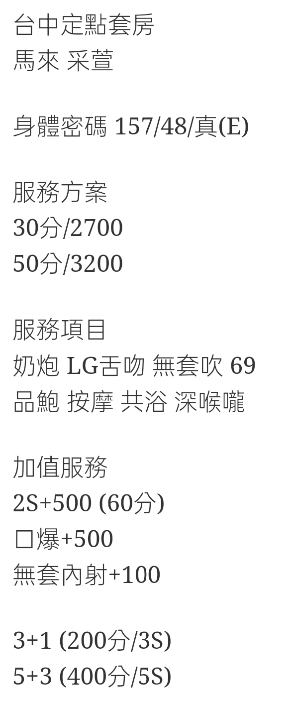 🇲🇾台中西屯馬來妹 采萱 台中定點套房 馬來 采萱 身體密碼 157/48/真(E) 服務方案 30分/2700 50分/3200 服務項目 奶炮 LG舌吻 無套吹 69 品鮑 按摩 共浴 深喉嚨 加值服務 2S+500 (60分) 口爆+500 無套內射+100 3+1 (200分/3S) 5+3 (400分/5S) 相關商品 Quick View Quick View 🇻🇳台中西屯越妹 璟羽 Quick View Quick View 🇻🇳台中西屯越妹 孫涵 Quick View Quick View 🇨🇳台中北屯港澳妹 羽黛