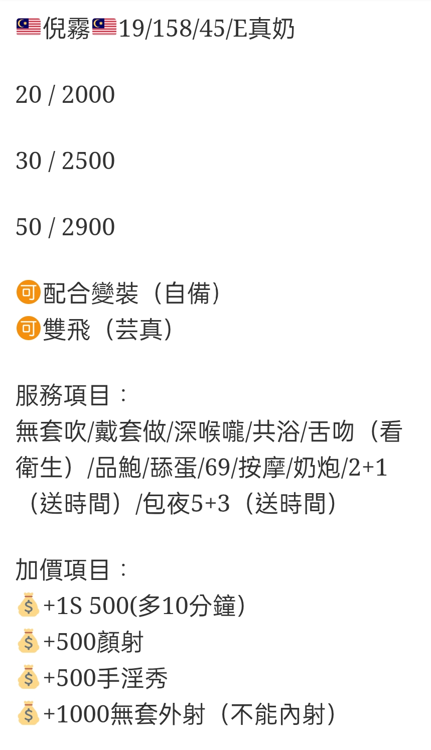 🇲🇾彰化定點馬來妹 倪霧 🇲🇾倪霧🇲🇾19/158/45/E真奶 20 / 2000 30 / 2500 50 / 2900 🉑️配合變裝(自備) 🉑雙飛(芸真) 服務項目: 無套吹/戴套做/深喉嚨/共浴/舌吻(看衛生)/品鮑/舔蛋/69/按摩/奶炮/2+1(送時間)/包夜5+3(送時間) 加價項目: 💰+1S 500(多10分鐘) 💰+500顏射 💰+500手淫秀 💰+1000無套外射(不能內射) 相關商品 Quick View Quick View 🇲🇾彰化定點馬來妹 寧寧 Quick View Quick View 🇻🇳彰化定點越妹 語芙 Quick View Quick View 🇲🇾彰化定點馬來妹 緞帶