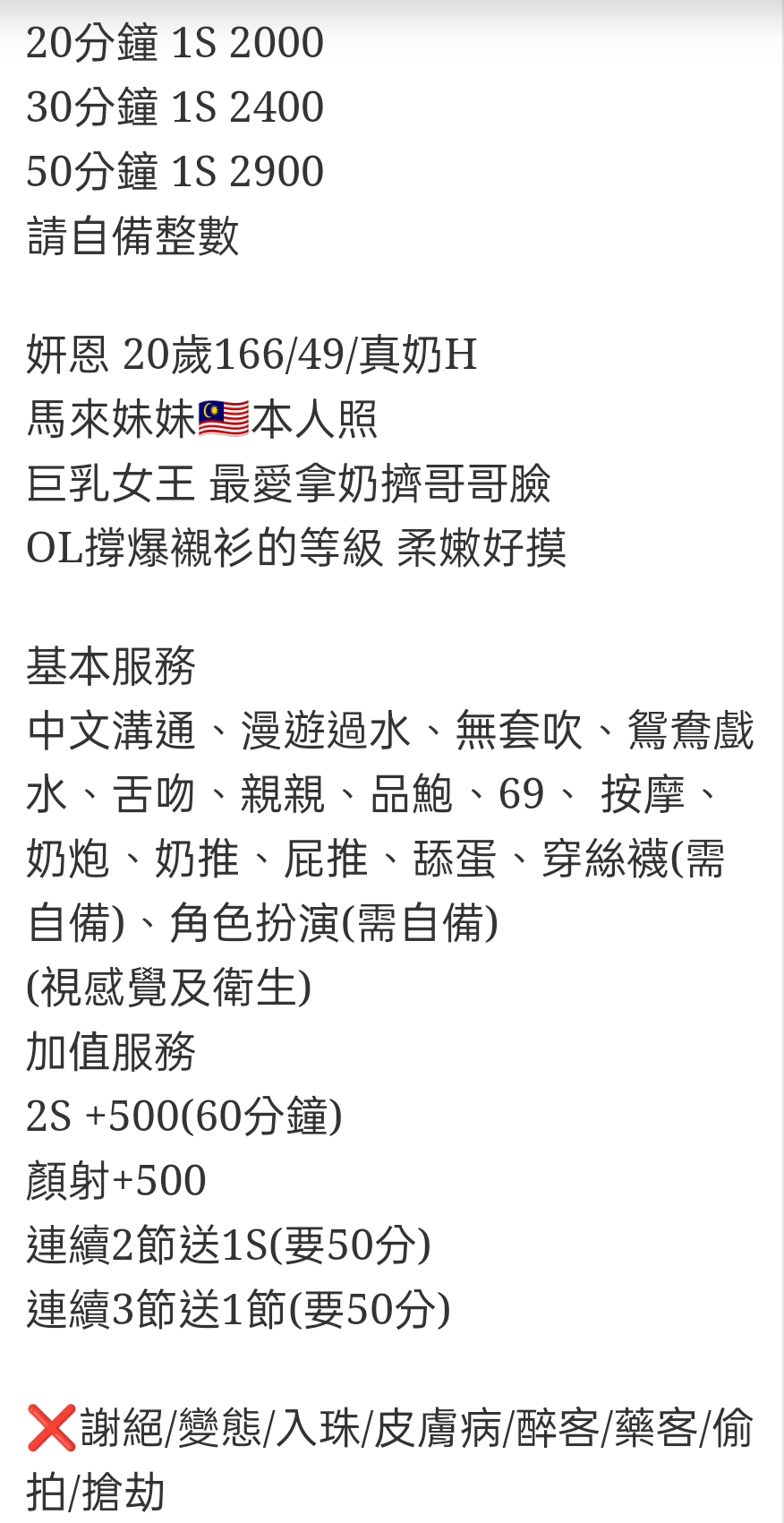 中文溝通、漫遊過水、無套吹、鴛鴦戲水、舌吻、親親、品鮑、69、 按摩、奶炮、奶推、屁推、舔蛋、穿絲襪(需自備)、角色扮演(需自備)