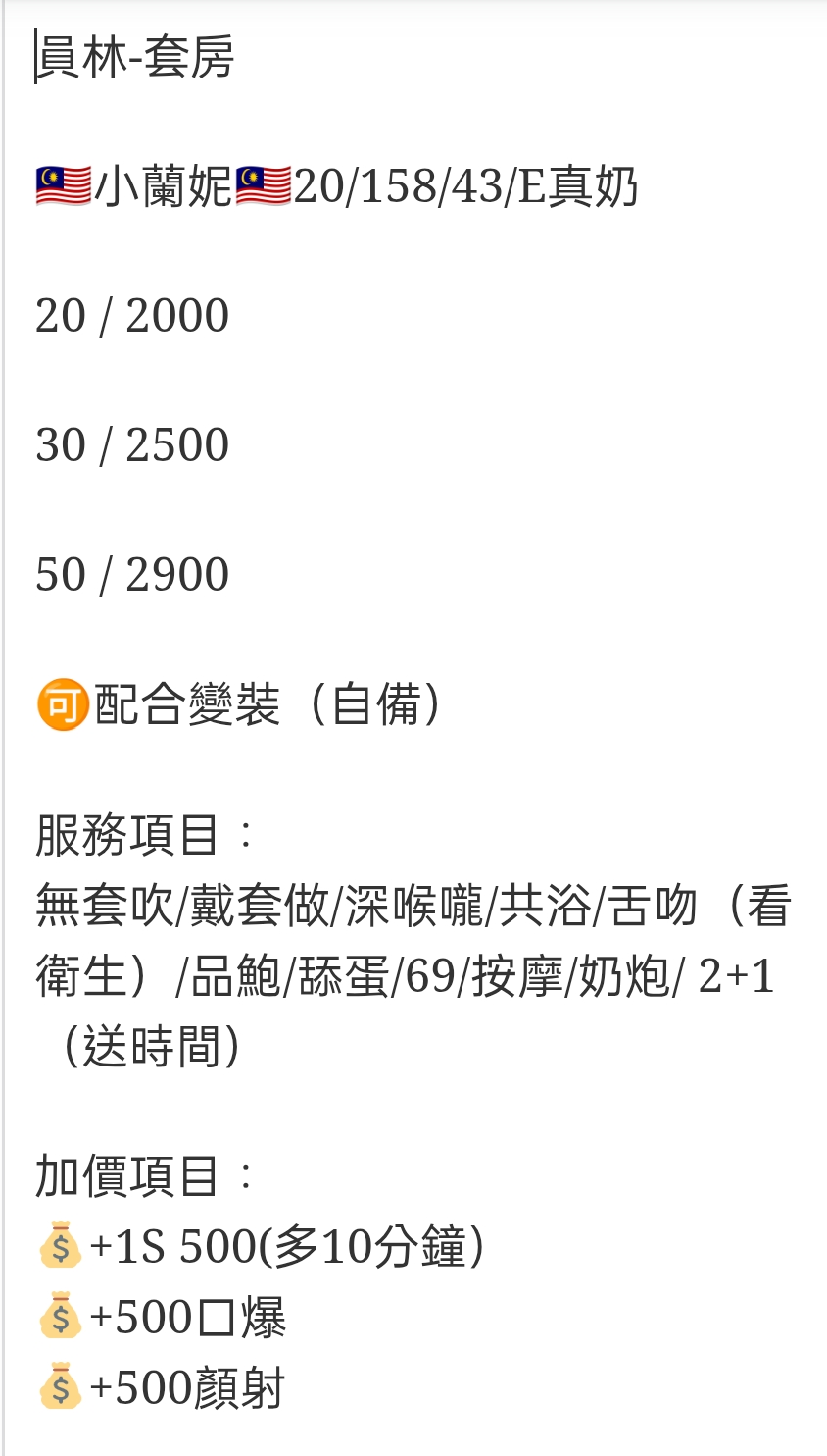 🇲🇾員林定點馬來妹 小蘭妮 員林-套房 🇲🇾小蘭妮🇲🇾20/158/43/E真奶 20 / 2000 30 / 2500 50 / 2900 🉑️配合變裝(自備) 服務項目: 無套吹/戴套做/深喉嚨/共浴/舌吻(看衛生)/品鮑/舔蛋/69/按摩/奶炮/ 2+1(送時間) 加價項目: 💰+1S 500(多10分鐘) 💰+500口爆 💰+500顏射 相關商品 Quick View Quick View 🇲🇾員林定點馬來妹 朴海茵 Quick View Quick View 🇲🇾員林定點馬來妹 夏希 Quick View Quick View 🇲🇾員林定點馬來妹 喬欣