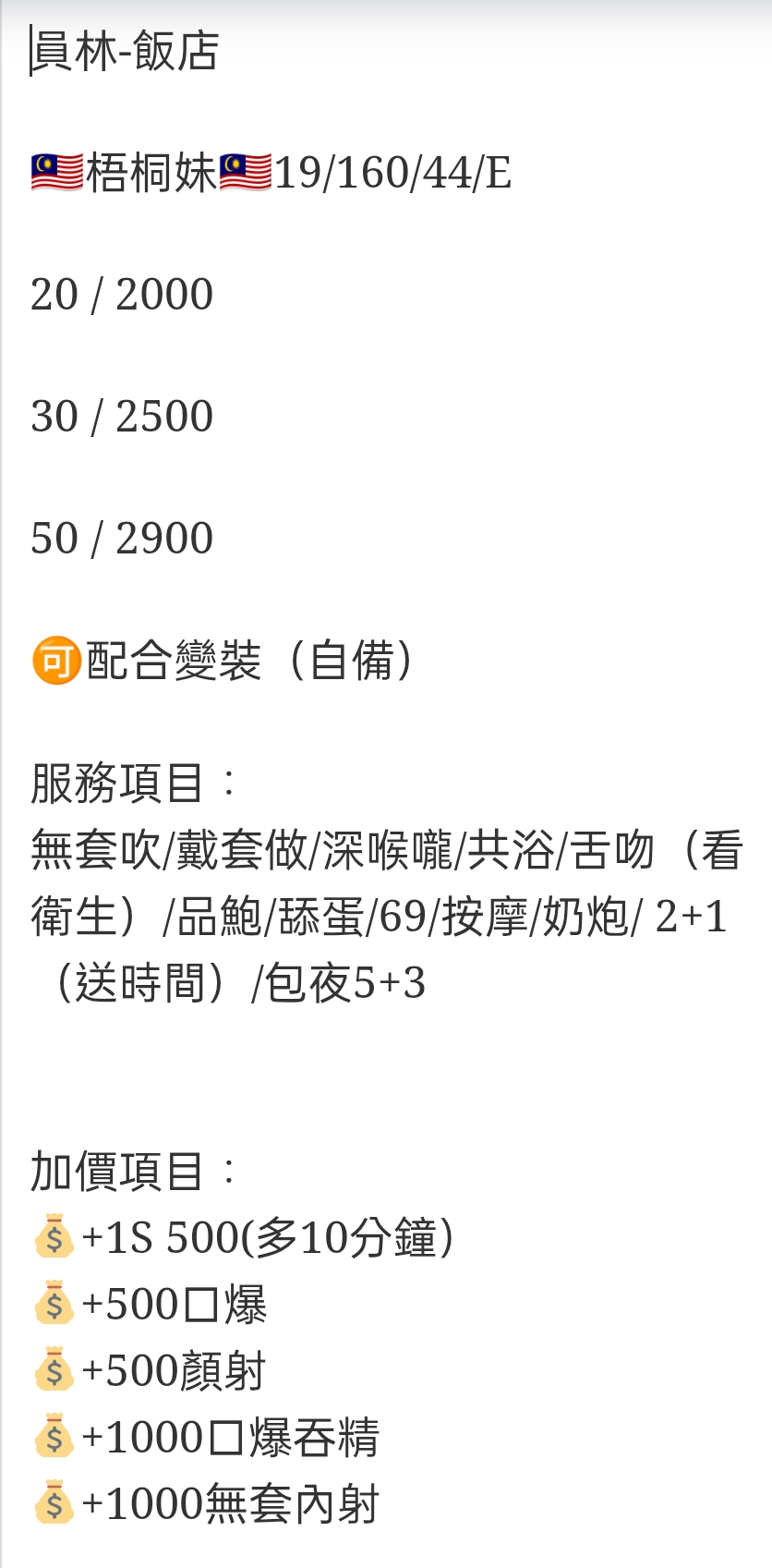 🇲🇾員林定點馬來妹 梧桐妹 員林-飯店 🇲🇾梧桐妹🇲🇾19/160/44/E 20 / 2000 30 / 2500 50 / 2900 🉑️配合變裝(自備) 服務項目: 無套吹/戴套做/深喉嚨/共浴/舌吻(看衛生)/品鮑/舔蛋/69/按摩/奶炮/ 2+1(送時間)/包夜5+3 加價項目: 💰+1S 500(多10分鐘) 💰+500口爆 💰+500顏射 💰+1000口爆吞精 💰+1000無套內射 相關商品 Quick View Quick View 🇲🇾員林定點馬來妹 香婷 Quick View Quick View 🇲🇾員林定點馬來妹 妃比 Quick View Quick View 🇲🇾員林定點馬來妹 花香