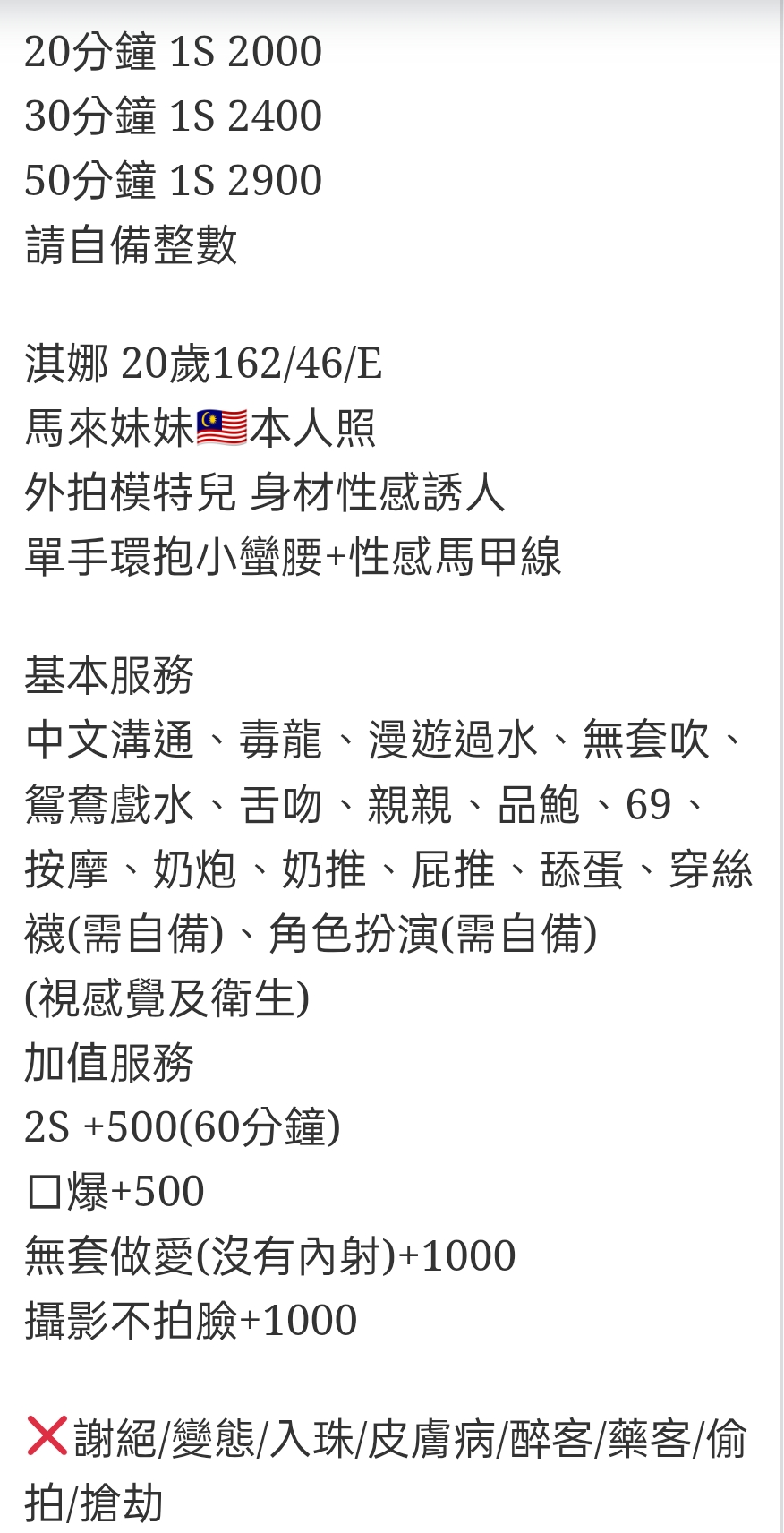 中文溝通、毒龍、漫遊過水、無套吹、鴛鴦戲水、舌吻、親親、品鮑、69、 按摩、奶炮、奶推、屁推、舔蛋、穿絲襪(需自備)、角色扮演(需自備)
