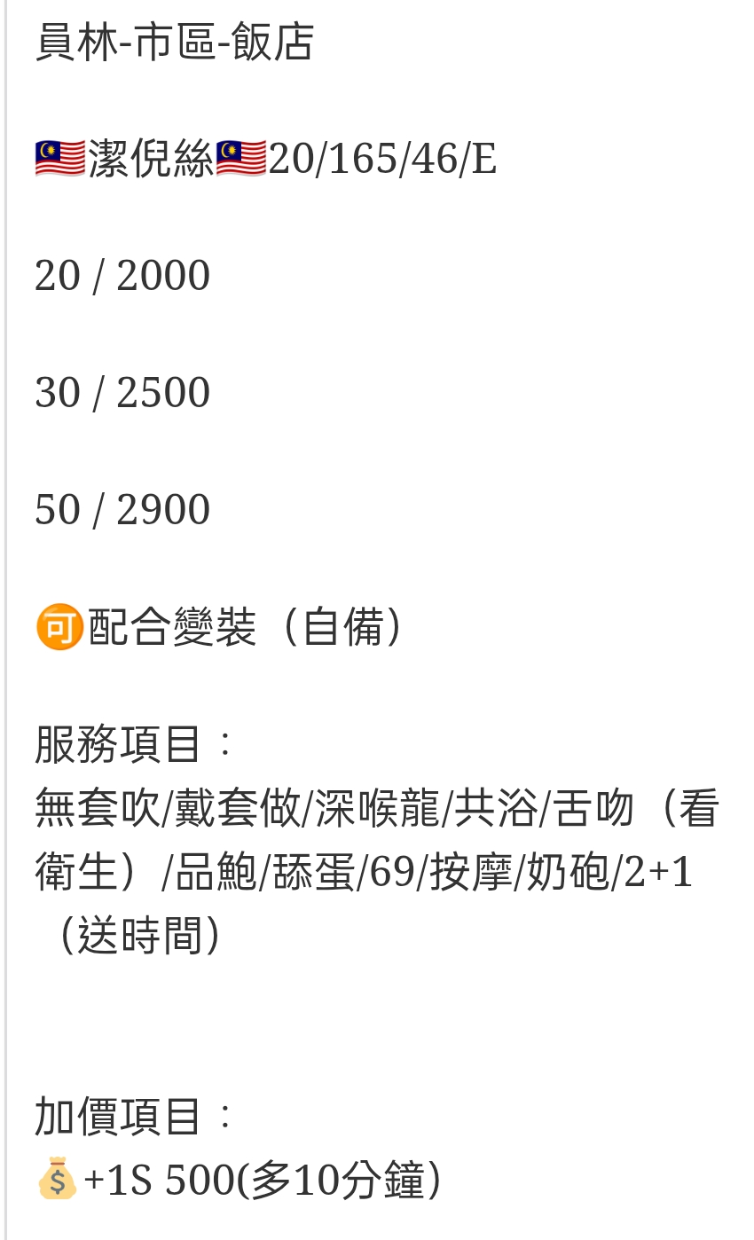 🇲🇾員林定點馬來妹 潔倪絲 員林-市區-飯店 🇲🇾潔倪絲🇲🇾20/165/46/E 20 / 2000 30 / 2500 50 / 2900 🉑配合變裝(自備) 服務項目: 無套吹/戴套做/深喉龍/共浴/舌吻(看衛生)/品鮑/舔蛋/69/按摩/奶砲/2+1(送時間) 加價項目: 💰+1S 500(多10分鐘) 相關商品 Quick View Quick View 🇲🇾員林定點馬來妹 妃比 Quick View Quick View 🇲🇾員林定點馬來妹 小晴 Quick View Quick View 🇲🇾員林定點馬來妹 亮亮