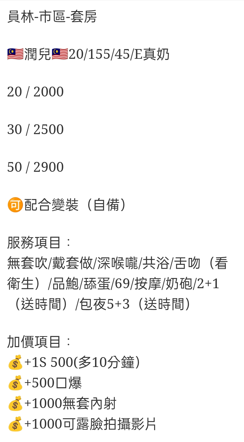 🇲🇾員林定點馬來妹 潤兒 員林-市區-套房 潤兒 20/155/45/E真奶 20 / 2000 30 / 2500 50 / 2900 ?配合變裝(自備) 服務項目: 無套吹/戴套做/深喉嚨/共浴/舌吻(看衛生)/品鮑/舔蛋/69/按摩/奶砲/2+1(送時間)/包夜5+3(送時間) 加價項目: +1S 500(多10分鐘) +500口爆 +1000無套內射 +1000可露臉拍攝影片 相關商品 Quick View Quick View 🇲🇾員林定點馬來妹 金裕貞 Quick View Quick View 🇲🇾員林定點馬來妹 徐露 Quick View Quick View 🇲🇾員林定點馬來妹 右右