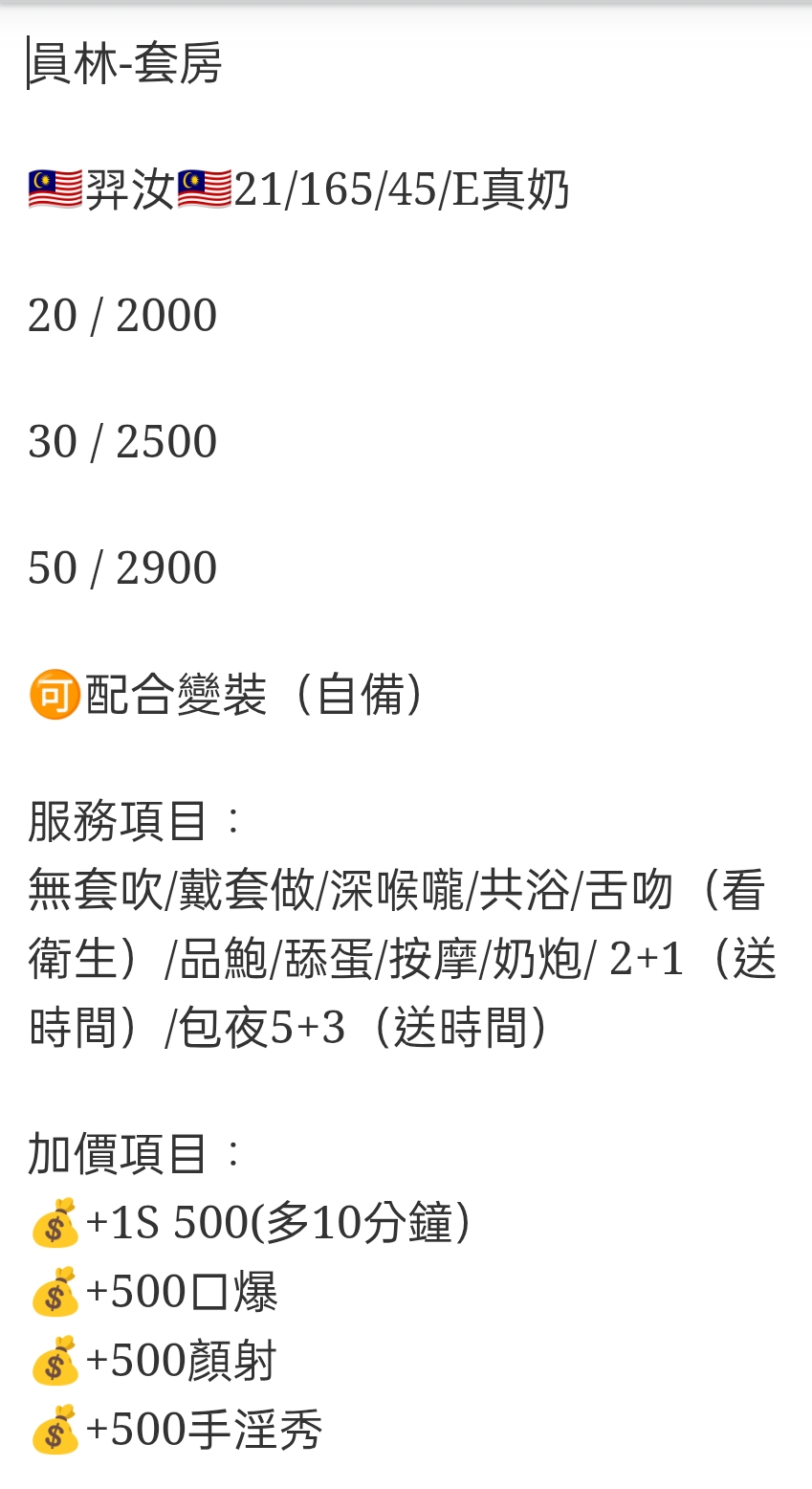 🇲🇾員林定點馬來妹 羿汝 員林-套房 🇲🇾羿汝🇲🇾21/165/45/E真奶 20 / 2000 30 / 2500 50 / 2900 🉑️配合變裝(自備) 服務項目: 無套吹/戴套做/深喉嚨/共浴/舌吻(看衛生)/品鮑/舔蛋/按摩/奶炮/ 2+1(送時間)/包夜5+3(送時間) 加價項目: 💰+1S 500(多10分鐘) 💰+500口爆 💰+500顏射 💰+500手淫秀 相關商品 Quick View Quick View 🇲🇾員林定點馬來妹 念恩 Quick View Quick View 🇲🇾員林定點馬來妹 芊樂 Quick View Quick View 🇻🇳員林定點越妹 妃凡