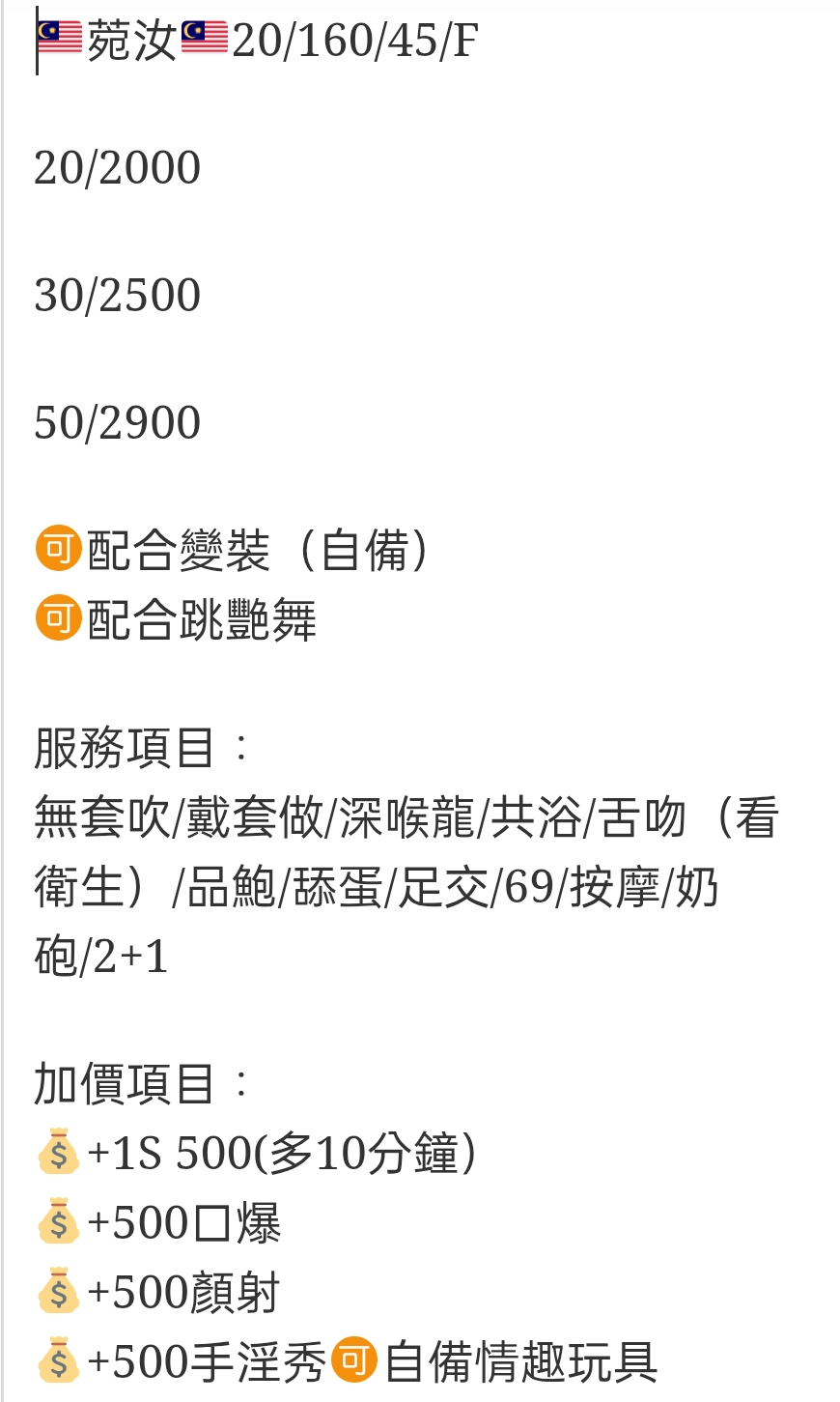 🇲🇾員林定點馬來妹 菀汝 🇲🇾菀汝🇲🇾20/160/45/F 20/2000 30/2500 50/2900 🉑️配合變裝(自備) 🉑配合跳艷舞 服務項目: 無套吹/戴套做/深喉龍/共浴/舌吻(看衛生)/品鮑/舔蛋/足交/69/按摩/奶砲/2+1 加價項目: 💰+1S 500(多10分鐘) 💰+500口爆 💰+500顏射 💰+500手淫秀🉑自備情趣玩具 相關商品 Quick View Quick View 🇲🇾員林定點馬來妹 豆豆 Quick View Quick View 🇲🇾員林定點馬來妹 芊樂 Quick View Quick View 🇲🇾員林定點馬來妹 喬欣