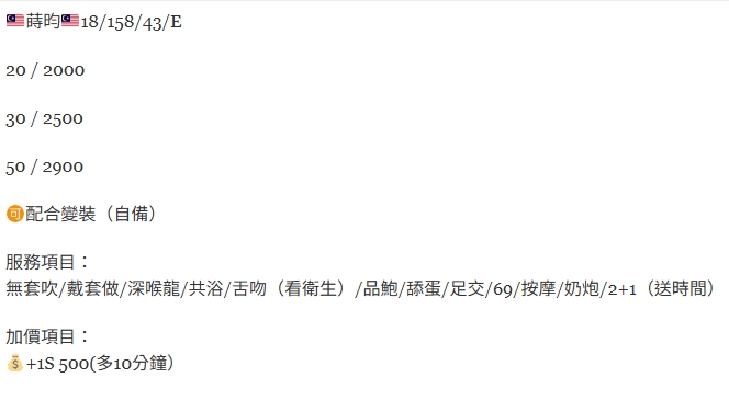 🇲🇾彰化定點馬來妹 蒔昀 🇲🇾蒔昀🇲🇾18/158/43/E 20 / 2000 30 / 2500 50 / 2900 🉑配合變裝(自備) 服務項目: 無套吹/戴套做/深喉龍/共浴/舌吻(看衛生)/品鮑/舔蛋/足交/69/按摩/奶炮/2+1(送時間) 加價項目: 💰+1S 500(多10分鐘) 相關商品 Quick View Quick View 🇲🇾彰化定點馬來妹 薇恩 Quick View Quick View 🇲🇾彰化定點馬來妹 騷貓 Quick View Quick View 🇲🇾彰化定點馬來妹 萊兒
