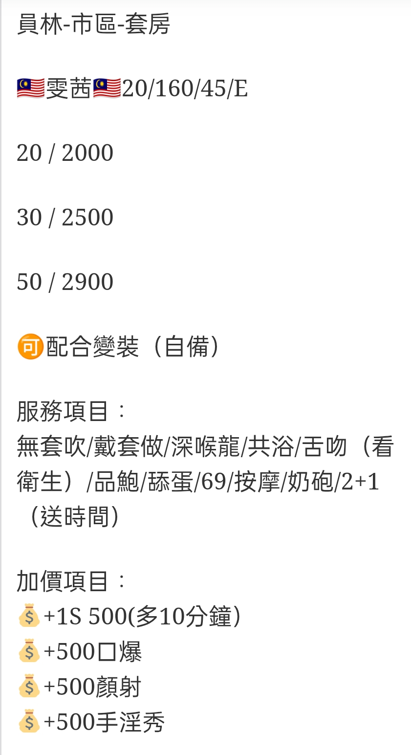 🇲🇾員林定點馬來妹 雯茜 員林-市區-套房 🇲🇾雯茜🇲🇾20/160/45/E 20 / 2000 30 / 2500 50 / 2900 🉑配合變裝(自備) 服務項目: 無套吹/戴套做/深喉龍/共浴/舌吻(看衛生)/品鮑/舔蛋/69/按摩/奶砲/2+1(送時間) 加價項目: 💰+1S 500(多10分鐘) 💰+500口爆 💰+500顏射 💰+500手淫秀 相關商品 Quick View Quick View 🇻🇳員林定點越妹 漢娜 Quick View Quick View 🇲🇾員林定點馬來妹 香婷 Quick View Quick View 🇲🇾員林定點馬來妹 芊樂
