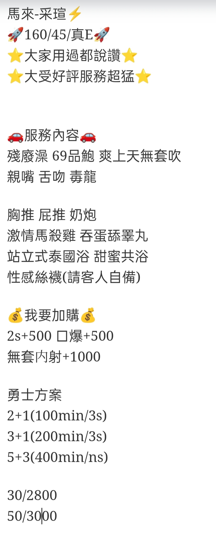 🇲🇾嘉義定點馬來妹 采瑄 馬來-采瑄⚡️ 160/45/真E ⭐️大家用過都說讚⭐️ ⭐️大受好評服務超猛⭐️ 服務內容 殘廢澡 69品鮑 爽上天無套吹 親嘴 舌吻 毒龍 胸推 屁推 奶炮 激情馬殺雞 吞蛋舔睪丸 站立式泰國浴 甜蜜共浴 性感絲襪(請客人自備) 我要加購 2s+500 口爆+500 無套内射+1000 勇士方案 2+1(100min/3s) 3+1(200min/3s) 5+3(400min/ns) 30/2800 50/3000