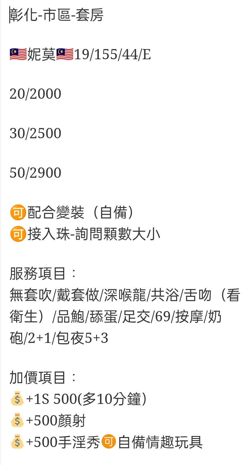 🇲🇾彰化定點馬來妹 妮莫 彰化-市區-套房 🇲🇾妮莫🇲🇾19/155/44/E 20/2000 30/2500 50/2900 🉑️配合變裝(自備) 🉑接入珠-詢問顆數大小 服務項目: 無套吹/戴套做/深喉龍/共浴/舌吻(看衛生)/品鮑/舔蛋/足交/69/按摩/奶砲/2+1/包夜5+3 加價項目: 💰+1S 500(多10分鐘) 💰+500顏射 💰+500手淫秀🉑自備情趣玩具 相關商品 Quick View Quick View 🇲🇾彰化定點馬來妹 糖寶 Quick View Quick View 🇲🇾彰化定點馬來妹 槿蕎 Quick View Quick View 🇲🇾彰化定點馬來妹 蒂娜