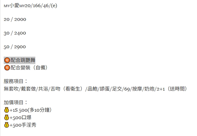 🇲🇾彰化定點馬來妹 小愛 小愛 20/166/46/(e) 20 / 2000 30 / 2400 50 / 2900 配合跳艷舞 配合變裝(自備) 服務項目: 無套吹/戴套做/共浴/舌吻(看衛生)/品鮑/舔蛋/足交/69/按摩/奶炮/2+1(送時間) 加價項目: +1S 500(多10分鐘) +500口爆 +500手淫秀 相關商品 Quick View Quick View 🇲🇾彰化定點馬來妹 爾晴 Quick View Quick View 🇲🇾彰化定點馬來妹 槿蕎 Quick View Quick View 🇻🇳彰化定點越妹 語芙