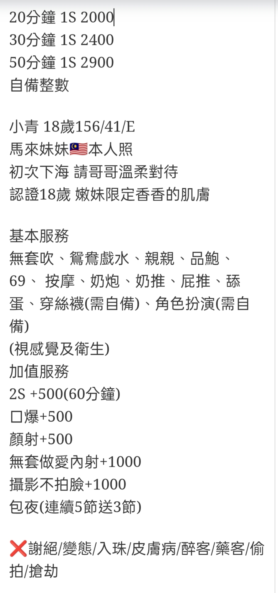 無套吹、鴛鴦戲水、親親、品鮑、69、 按摩、奶炮、奶推、屁推、舔蛋、穿絲襪(需自備)、角色扮演(需自備)