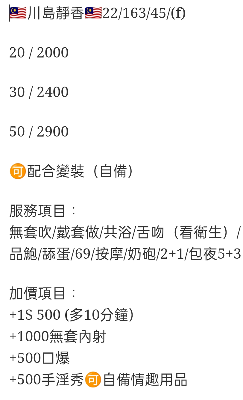 🇲🇾員林定點馬來妹 川島靜香 川島靜香 22/163/45/(f) 20 / 2000 30 / 2400 50 / 2900 配合變裝(自備) 服務項目: 無套吹/戴套做/共浴/舌吻(看衛生)/品鮑/舔蛋/69/按摩/奶砲/2+1/包夜5+3 加價項目: +1S 500 (多10分鐘) +1000無套內射 +500口爆 +500手淫秀 自備情趣用品 相關商品 Quick View Quick View 🇲🇾員林定點馬來妹 恰恰 Quick View Quick View 🇲🇾員林定點馬來妹 念恩 Quick View Quick View 🇲🇾員林定點馬來妹 花香