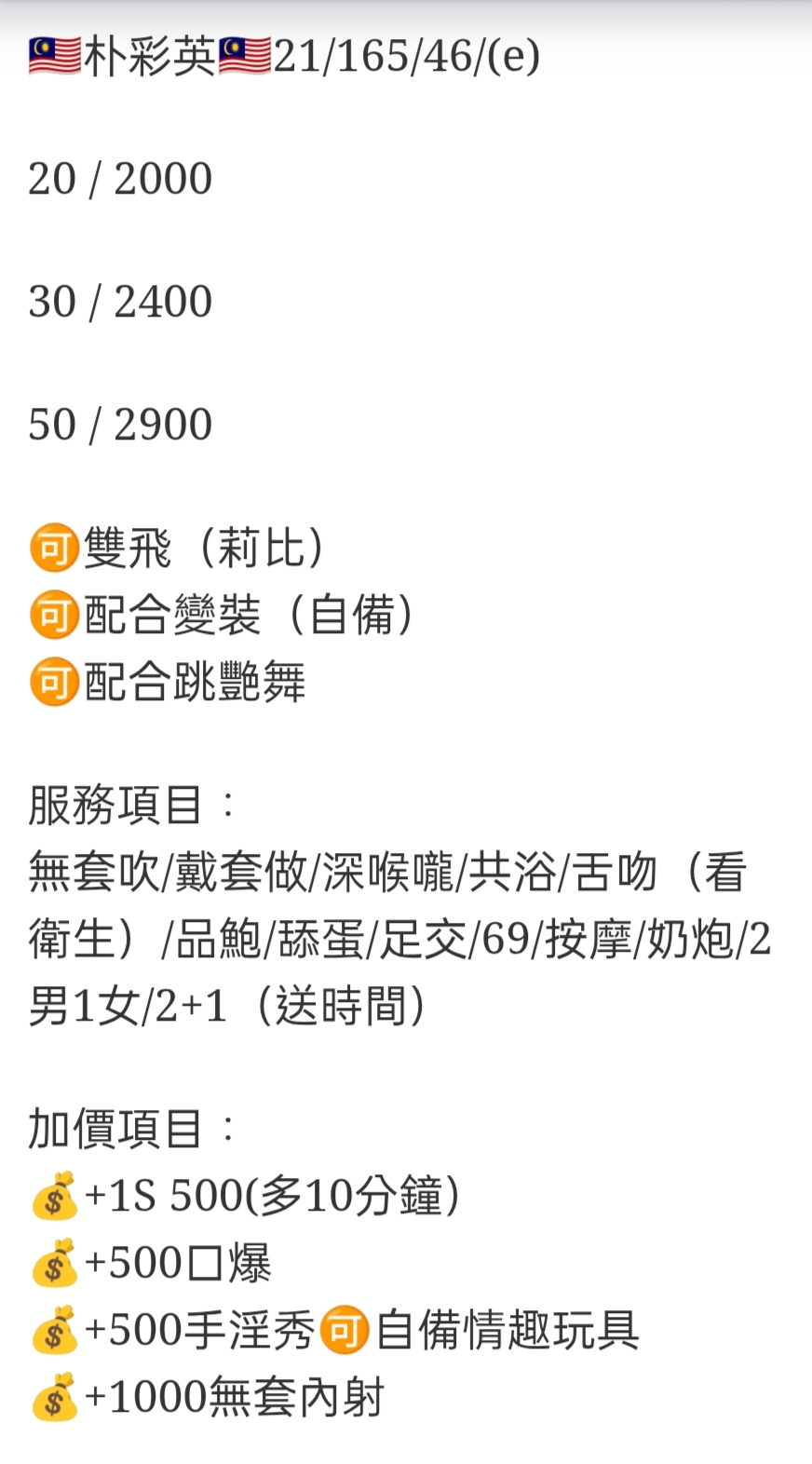 🇲🇾員林定點馬來妹 朴彩英 朴彩英 21/165/46/(e) 20 / 2000 30 / 2400 50 / 2900 雙飛(莉比) 配合變裝(自備) 配合跳艷舞 服務項目: 無套吹/戴套做/深喉嚨/共浴/舌吻(看衛生)/品鮑/舔蛋/足交/69/按摩/奶炮/2男1女/2+1(送時間) 加價項目: +1S 500(多10分鐘) +500口爆 +500手淫秀 自備情趣玩具 +1000無套內射 相關商品 Quick View Quick View 🇲🇾員林定點馬來妹 朴海茵 Quick View Quick View 🇻🇳員林定點越妹 希媛