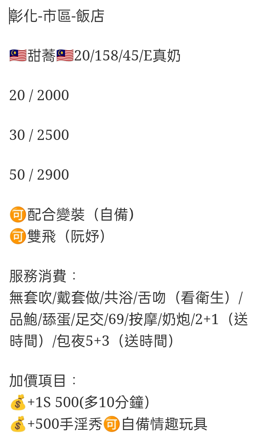 🇲🇾彰化定點馬來妹 甜蕎 彰化-市區-飯店 甜蕎 20/158/45/E真奶 20 / 2000 30 / 2500 50 / 2900 配合變裝(自備) 雙飛(阮妤) 服務消費: 無套吹/戴套做/共浴/舌吻(看衛生)/品鮑/舔蛋/足交/69/按摩/奶炮/2+1(送時間)/包夜5+3(送時間) 加價項目: +1S 500(多10分鐘) +500手淫秀 自備情趣玩具 相關商品 Quick View Quick View 🇲🇾彰化定點馬來妹 緞帶 Quick View Quick View 🇲🇾彰化定點馬來妹 槿蕎 Quick View Quick View 🇲🇾彰化定點馬來妹 靜淳