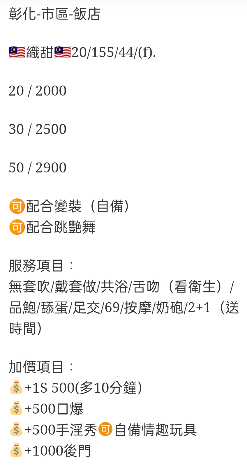 🇲🇾彰化定點馬來妹 織甜 彰化-市區-飯店 🇲🇾織甜🇲🇾20/155/44/(f). 20 / 2000 30 / 2500 50 / 2900 🉑配合變裝(自備) 🉑配合跳艷舞 服務項目: 無套吹/戴套做/共浴/舌吻(看衛生)/品鮑/舔蛋/足交/69/按摩/奶砲/2+1(送時間) 加價項目: 💰+1S 500(多10分鐘) 💰+500口爆 💰+500手淫秀🉑自備情趣玩具 💰+1000後門 相關商品 Quick View Quick View 🇲🇾彰化定點馬來妹 萊兒 Quick View Quick View 🇲🇾彰化定點馬來妹 靜姝 Quick View Quick View 🇻🇳彰化定點越妹 林蕎