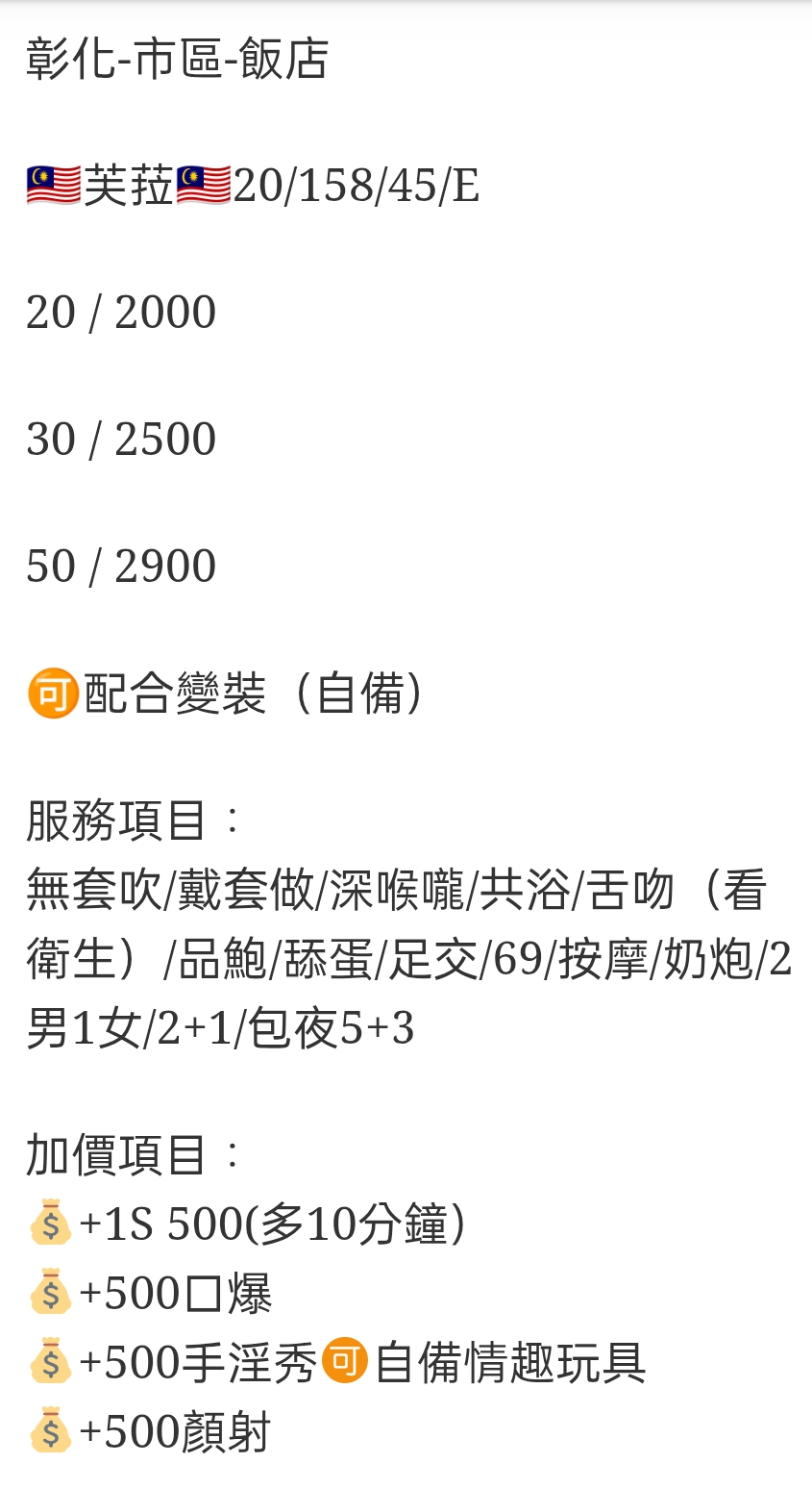 🇲🇾彰化定點馬來妹 芙菈 彰化-市區-飯店 🇲🇾芙菈🇲🇾20/158/45/E 20 / 2000 30 / 2500 50 / 2900 🉑️配合變裝(自備) 服務項目: 無套吹/戴套做/深喉嚨/共浴/舌吻(看衛生)/品鮑/舔蛋/足交/69/按摩/奶炮/2男1女/2+1/包夜5+3 加價項目: 💰+1S 500(多10分鐘) 💰+500口爆 💰+500手淫秀🉑自備情趣玩具 💰+500顏射 相關商品 Quick View Quick View 🇲🇾彰化定點馬來妹 糖寶 Quick View Quick View 🇲🇾彰化定點馬來妹 萊兒 Quick View Quick View 🇲🇾彰化定點馬來妹 騷貓