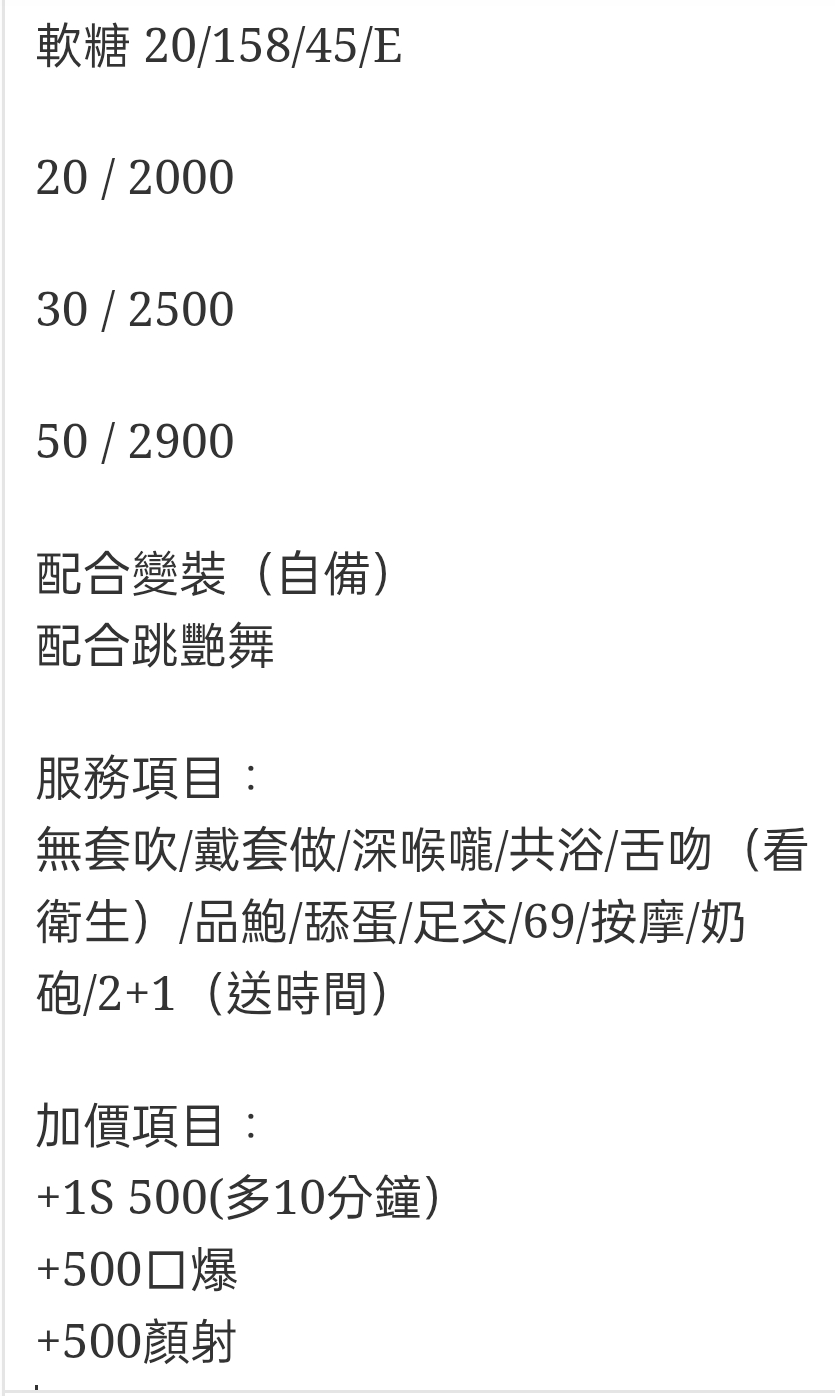 🇲🇾彰化定點馬來妹 軟糖 軟糖 20/158/45/E 20 / 2000 30 / 2500 50 / 2900 配合變裝(自備) 配合跳艷舞 服務項目: 無套吹/戴套做/深喉嚨/共浴/舌吻(看衛生)/品鮑/舔蛋/足交/69/按摩/奶砲/2+1(送時間) 加價項目: +1S 500(多10分鐘) +500口爆 +500顏射 +500手淫秀 相關商品 Quick View Quick View 🇲🇾彰化定點馬來妹 緞帶 Quick View Quick View 🇻🇳彰化定點越妹 彌亞 Quick View Quick View 🇲🇾彰化定點馬來妹 家寧