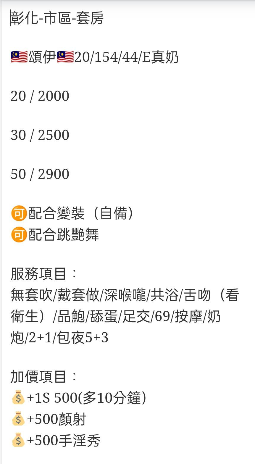 🇲🇾彰化定點馬來妹 頌伊 彰化-市區-套房 🇲🇾頌伊🇲🇾20/154/44/E真奶 20 / 2000 30 / 2500 50 / 2900 🉑️配合變裝(自備) 🉑配合跳艷舞 服務項目: 無套吹/戴套做/深喉嚨/共浴/舌吻(看衛生)/品鮑/舔蛋/足交/69/按摩/奶炮/2+1/包夜5+3 加價項目: 💰+1S 500(多10分鐘) 💰+500顏射 💰+500手淫秀 相關商品 Quick View Quick View 🇲🇾彰化定點馬來妹 李維維 Quick View Quick View 🇻🇳員林定點越妹 子倩