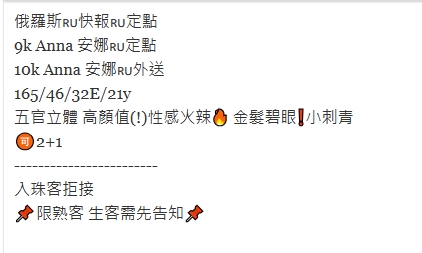 🇷🇺台中西屯金絲貓/可外約 安娜Anna 俄羅斯 快報 定點 9k Anna 安娜 定點 10k Anna 安娜 外送 165/46/32E/21y 五官立體 高顏值(!)性感火辣 金髮碧眼❗️小刺青 2+1 ———————— 入珠客拒接 限熟客 生客需先告知 相關商品 Quick View Quick View 🇯🇵台中西屯av女優 吹石玲奈 Quick View Quick View 🇯🇵台中西屯櫻花妹 麗子 Quick View Quick View 🇻🇳台中西屯越妹 孫涵