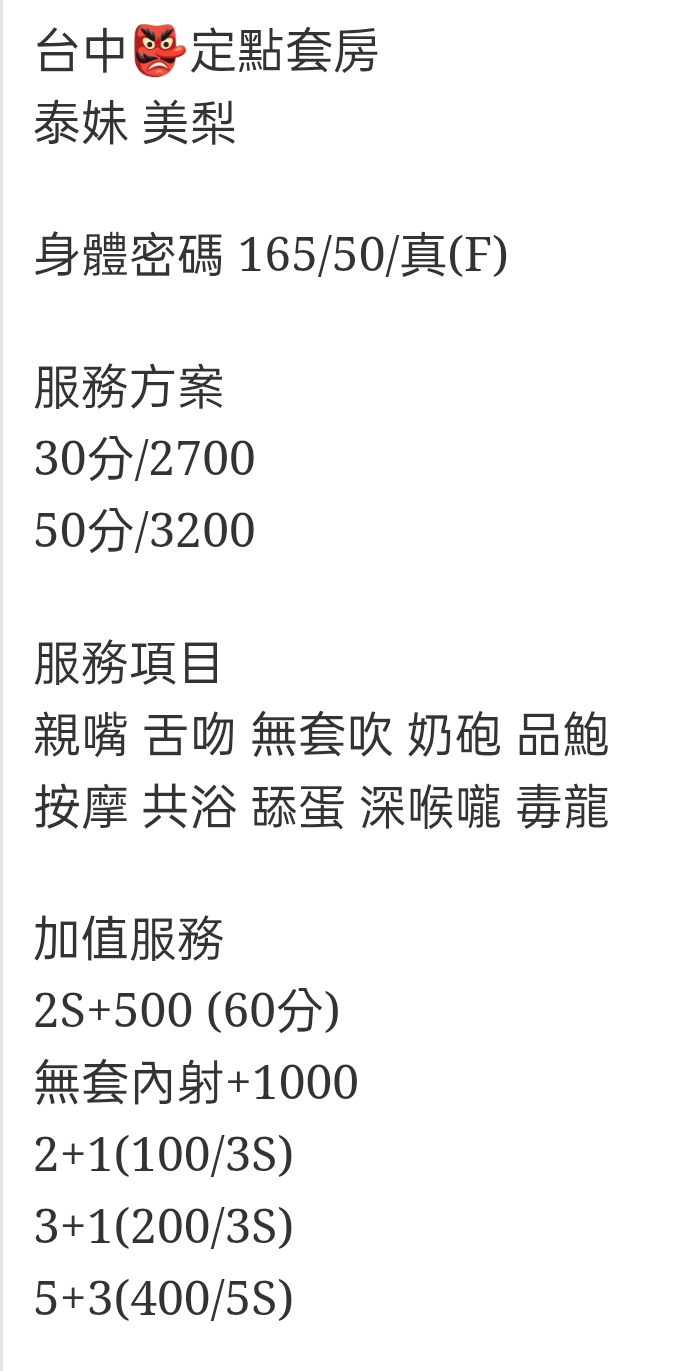 🇹🇭台中西屯泰妹 美梨 台中?定點套房 泰妹 美梨 身體密碼 165/50/真(F) 服務方案 30分/2700 50分/3200 服務項目 親嘴 舌吻 無套吹 奶砲 品鮑 按摩 共浴 舔蛋 深喉嚨 毒龍 加值服務 2S+500 (60分) 無套內射+1000 2+1(100/3S) 3+1(200/3S) 5+3(400/5S) 相關商品 Quick View Quick View 🇨🇳台中西屯港澳妹 妃雅 Quick View Quick View 🇻🇳台中西屯越妹 芯芯 Quick View Quick View 🇻🇳台中西屯越妹 芝媛