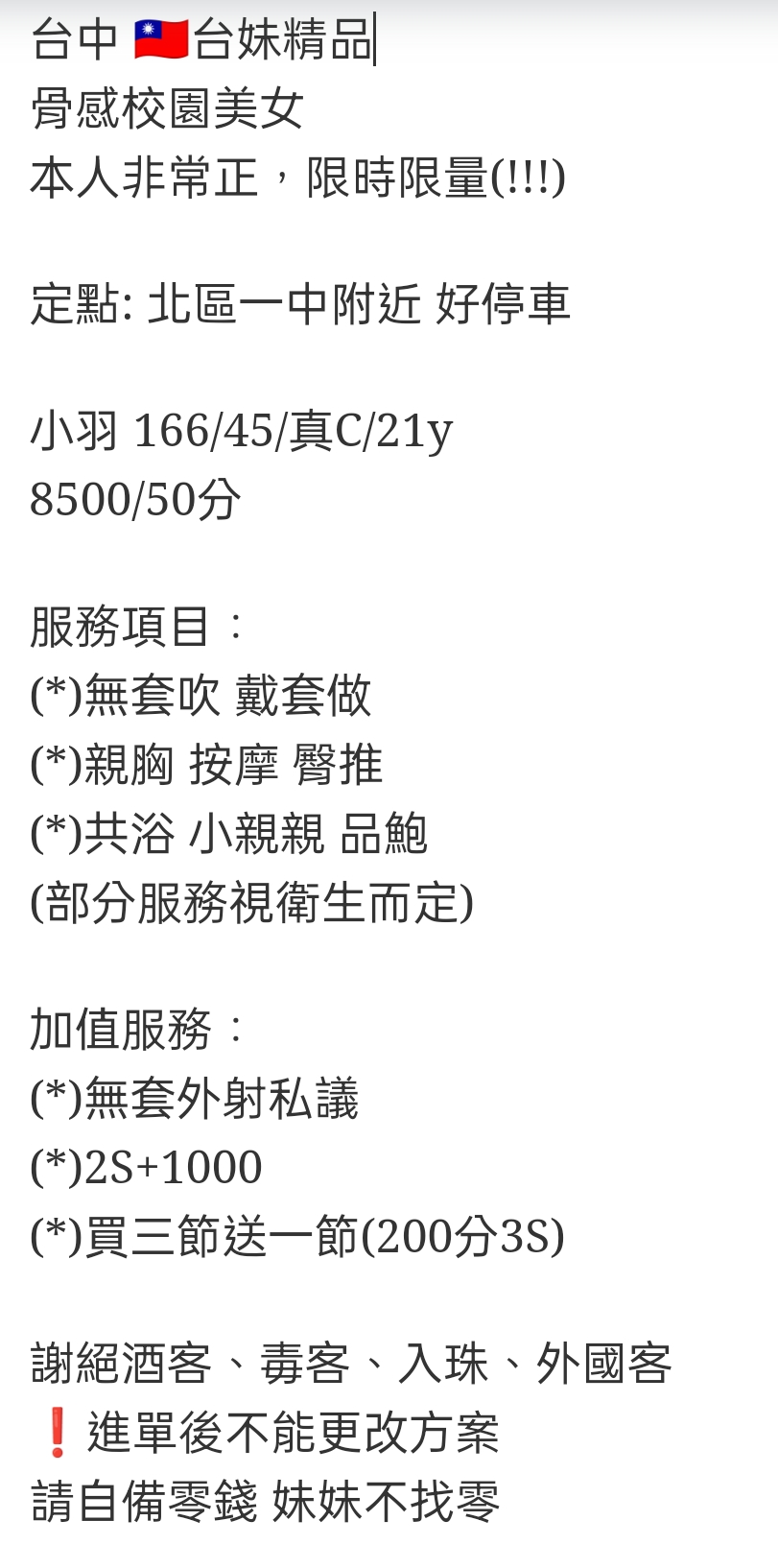 🇹🇼台中北區定點台妹 小羽 台中 🇹🇼台妹精品 骨感校園美女 本人非常正,限時限量(!!!) 定點: 北區一中附近 好停車 小羽 166/45/真C/21y 8500/50分 服務項目: (*)無套吹 戴套做 (*)親胸 按摩 臀推 (*)共浴 小親親 品鮑 (部分服務視衛生而定) 加值服務: (*)無套外射私議 (*)2S+1000 (*)買三節送一節(200分3S) 謝絕酒客、毒客、入珠、外國客 ❗️進單後不能更改方案 請自備零錢 妹妹不找零 相關商品 Quick View Quick View 🇲🇾台中北區馬來妹 如如 Quick View Quick View 🇲🇾台中北區馬來妹 婷婷 Quick View Quick View 🇲🇾台中北區馬來妹 娃娃