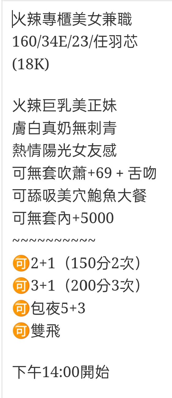 🇹🇼台中外約台妹 任羽芯 火辣專櫃美女兼職 160/34E/23/任羽芯 (18K) 火辣巨乳美正妹 膚白真奶無刺青 熱情陽光女友感 可無套吹蕭+69+舌吻 可舔吸美穴鮑魚大餐 可無套內+5000 ~~~~~~~~~~ ?2+1(150分2次) ?3+1(200分3次) ?包夜5+3 ?雙飛 下午14:00開始 相關商品 Quick View Quick View ??台中外約台妹 婭婭 Quick View Quick View 🇹🇼台中外約台妹 孫尚湘 Quick View Quick View 🇹🇼台中北區定點台妹/可外約 娃娃