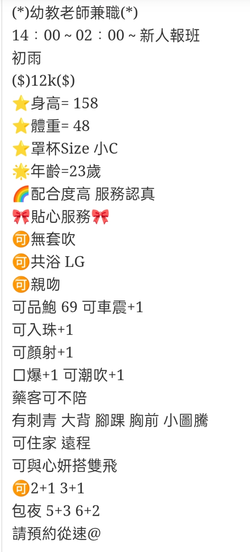 🇹🇼台中外約台妹 初雨 (*)幼教老師兼職(*) 14:00~02:00~新人報班 初雨 ($)12k($) ⭐️身高= 158 ⭐️體重= 48 ⭐️罩杯Size 小C 🌟年齡=23歲 🌈配合度高 服務認真 🎀貼心服務🎀 🉑️無套吹 🉑️共浴 LG 🉑️親吻 可品鮑 69 可車震+1 可入珠+1 可顏射+1 口爆+1 可潮吹+1 藥客可不陪 有刺青 大背 腳踝 胸前 小圖騰 可住家 遠程 可與心妍搭雙飛 🉑️2+1 3+1 包夜 5+3 6+2 請預約從速@ 相關商品 Quick View Quick View ??台中高檔外約台妹 韓伶 Quick View Quick View 🇹🇼台中高檔外約台妹 若瑤 Quick View Quick View 🇹🇼台中外約台妹 蕾蕾