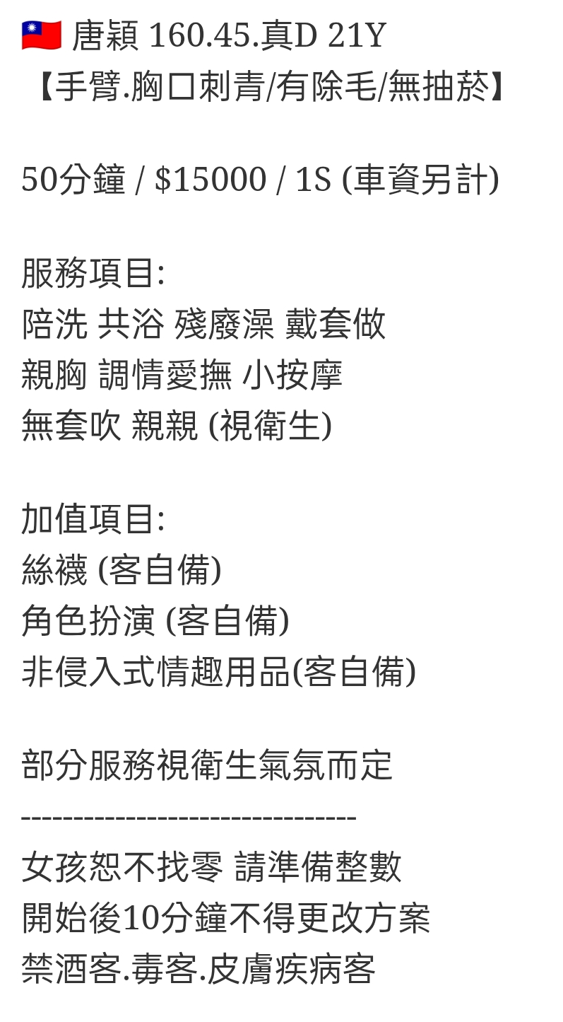 🇹🇼台中外約台妹 唐穎 🇹🇼 唐穎 160.45.真D 21Y 【手臂.胸口刺青/有除毛/無抽菸】 50分鐘 / $15000 / 1S (車資另計) 服務項目: 陪洗 共浴 殘廢澡 戴套做 親胸 調情愛撫 小按摩 無套吹 親親 (視衛生) 加值項目: 絲襪 (客自備) 角色扮演 (客自備) 非侵入式情趣用品(客自備) 部分服務視衛生氣氛而定 ——————————– 女孩恕不找零 請準備整數 開始後10分鐘不得更改方案 禁酒客.毒客.皮膚疾病客 相關商品 Quick View Quick View 🇹🇼台中高檔外約台妹 IG網美Jennie Quick View Quick View 🇹🇼台中外約台妹 徐娜兒 Quick View Quick View 🇹🇼台中外約台妹 孫尚湘