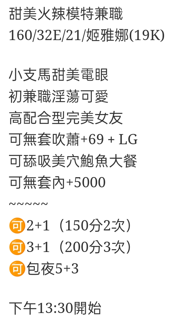 🇹🇼台中外約台妹 姬雅娜 甜美火辣模特兼職 160/32E/21/姬雅娜(19K) 小支馬甜美電眼 初兼職淫蕩可愛 高配合型完美女友 可無套吹蕭+69+LG 可舔吸美穴鮑魚大餐 可無套內+5000 ~~~~~ 2+1(150分2次) 3+1(200分3次) 包夜5+3 下午13:30開始 相關商品 Quick View Quick View 🇹🇼台中外約台妹 柔安 Quick View Quick View 🇹🇼台中外約台妹 芸妃